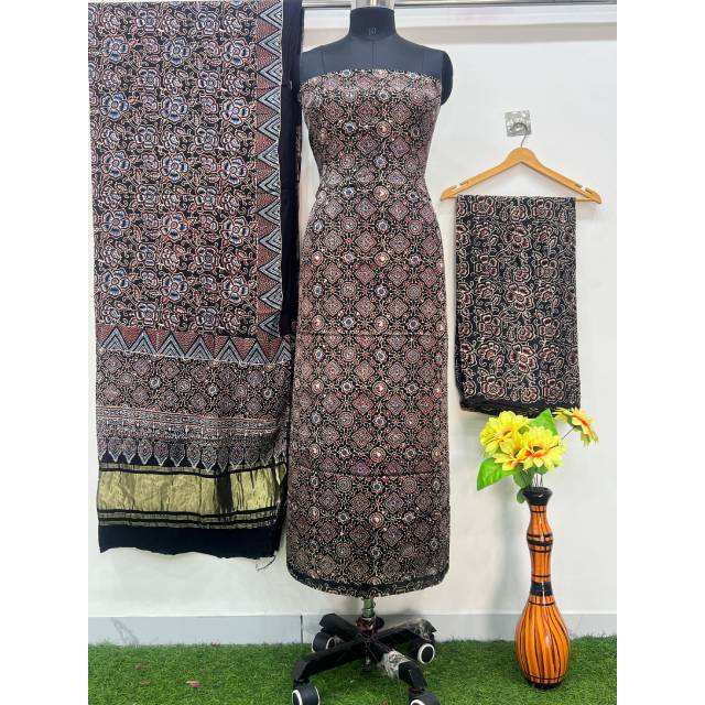 ชุดเดรสทรงเอสำหรับผู้หญิง ลายดอกไม้ พิมพ์ลายด้วยมือแบบ Ajrakh ย้อมสีธรรมชาติ ผลิตจากผ้าไหมโมดอลสีดำ Rose Mendeer แบบไม่ทอ เป็นมิตรต่อสิ่งแวดล้อม