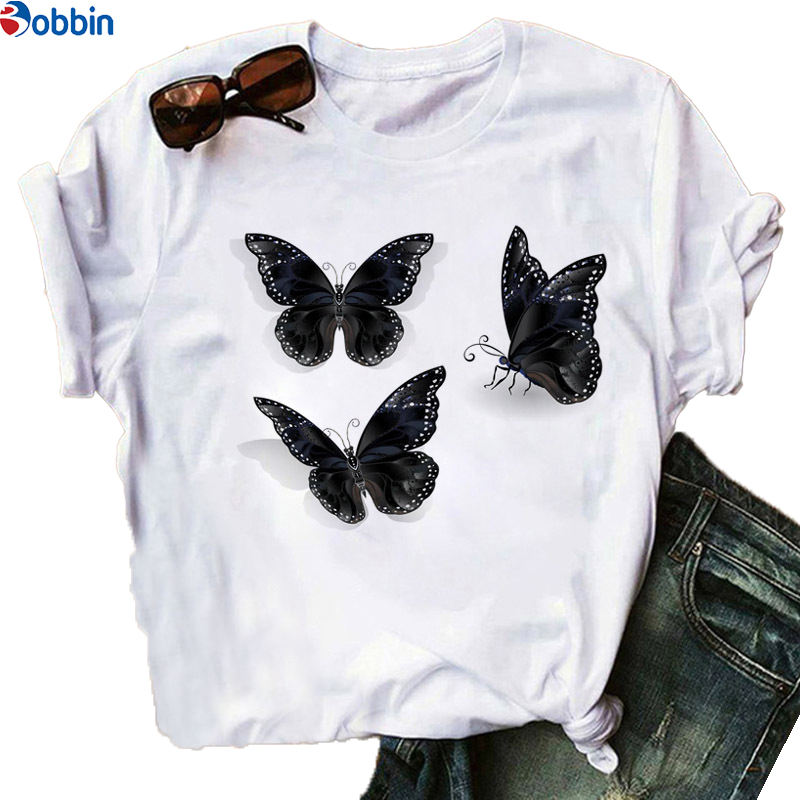 เสื้อยืดพิมพ์ลายผีเสื้อและดอกกุหลาบ ทรงหลวม ระบายอากาศได้ดี เสื้อยืดพิมพ์ลายกราฟิกแขนสั้นสำหรับผู้หญิง ไซส์พลัส เสื้อผ้าผู้หญิง