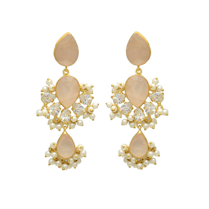 ต่างหูห้อยประดับมุกน้ำจืด โรสควอตซ์ และเพชรคิวบิกเซอร์โคเนีย ดีไซน์วินเทจ ชุบทอง 24K บนโลหะทองเหลือง สำหรับผู้หญิง เหมาะสำหรับงานแต่งงาน