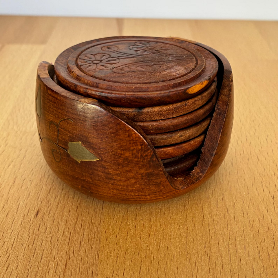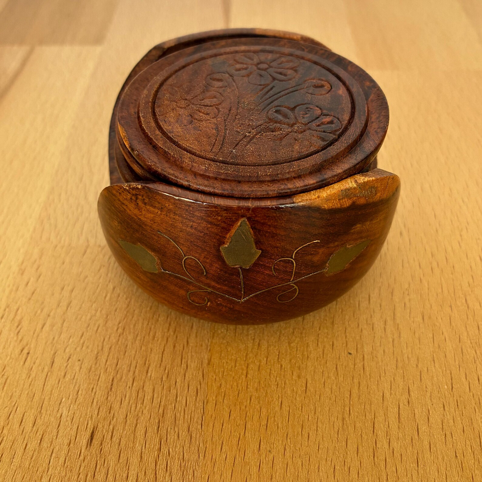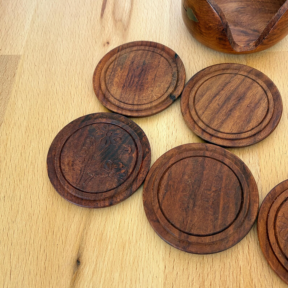 ชุดถาดรองแก้วไม้โรสวู้ดที่มีดีไซน์ฝังทองเหลืองหรูหราเหมาะสำหรับการตกแต่งโต๊ะรับประทานอาหารที่บ้านเหนือกาลเวลาจากอินเดีย