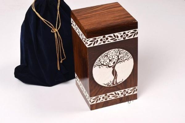โรสวูดออร์นสําหรับเถ้ามนุษย์ต้นไม้แห่งชีวิตกล่องไม้ส่วนบุคคลการเผาศพสําหรับเถ้าที่ทําด้วยมือขนาดใหญ่กล่องโกศไม้