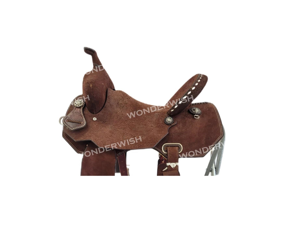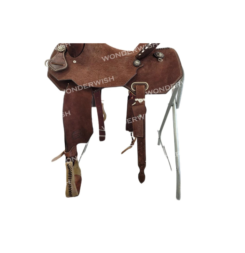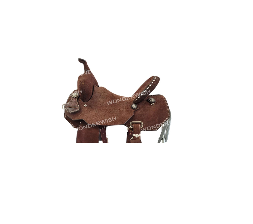 อานม้าหนังแท้สีน้ำตาลพร้อมโครงไฟเบอร์และชุดอุปกรณ์ขี่ม้าแบบตะวันตก ขนาด 10-18 นิ้ว หนังย้อมสีแบบดรัม ดีไซน์แบบ Rough Out