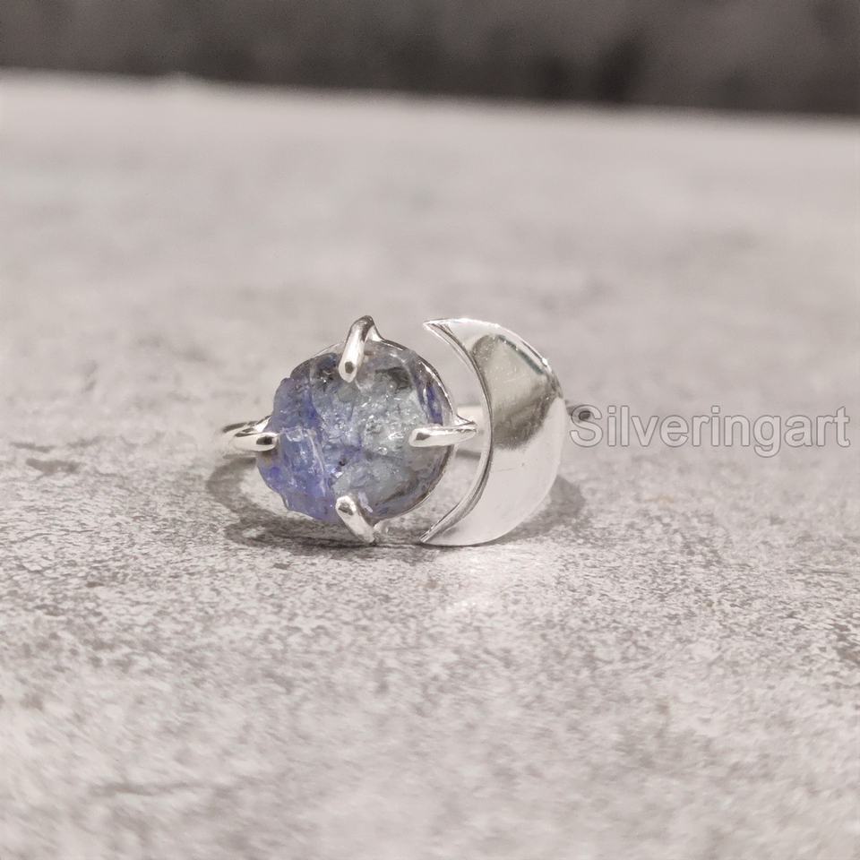 เครื่องประดับหินหยาบแหวนผู้หญิงพลอยธรรมชาติแทนซาไนต์ประดับอัญมณีรูปพระจันทร์เสี้ยววงเดือนสำหรับปาร์ตี้แหวนเงินสเตอร์ลิง925