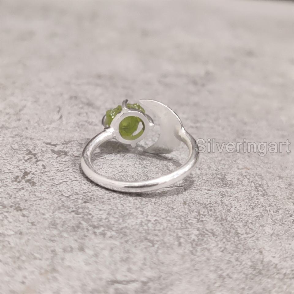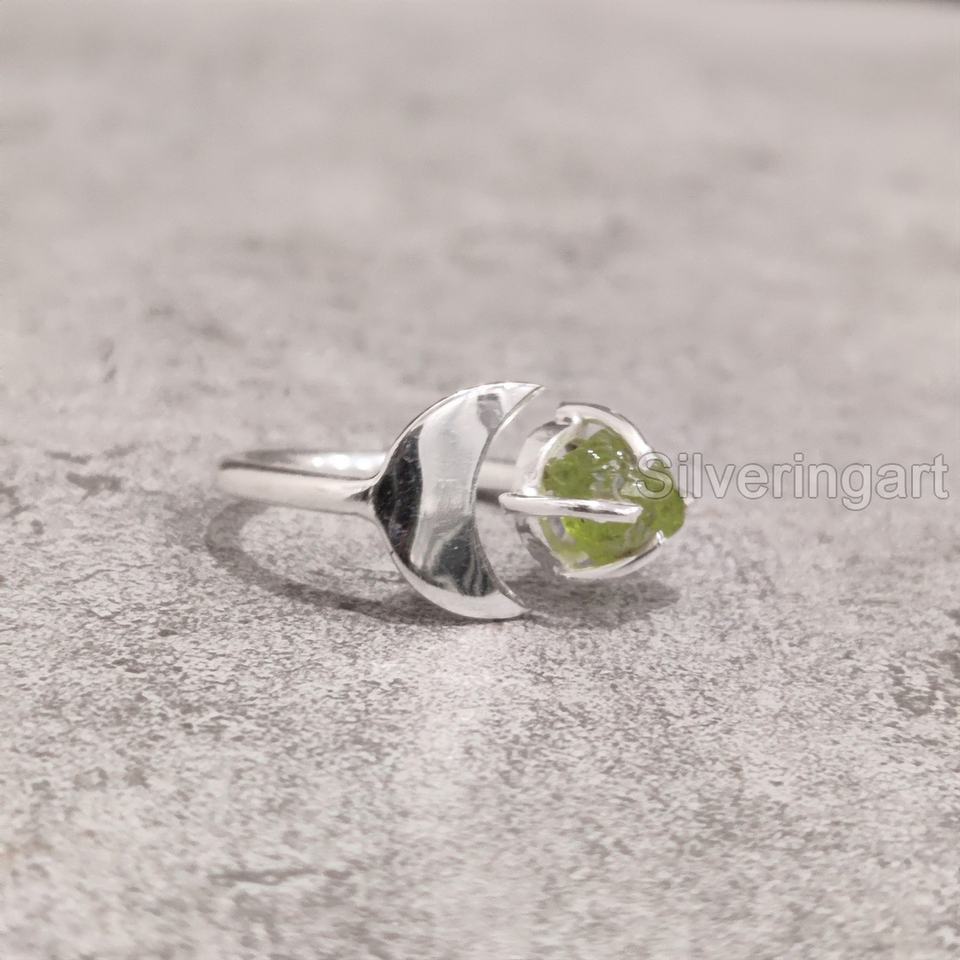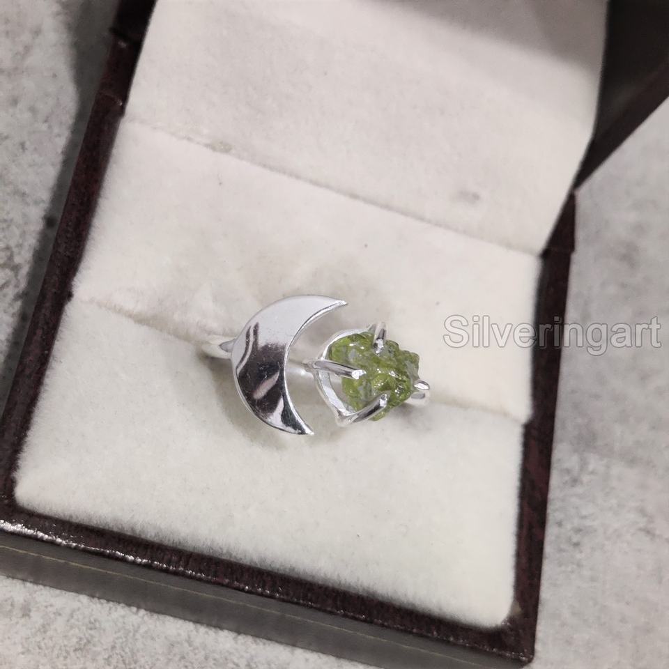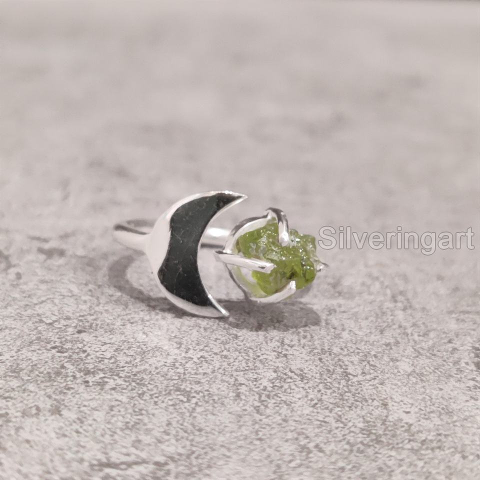 เครื่องประดับหินหยาบแหวนผู้หญิงพลอยเพอริโดแบบธรรมชาติอัญมณีออคสเตอร์ริ่ง925จันทร์เสี้ยววงเดือนคริสต์มาสแหวนเงินสเตอร์ลิง