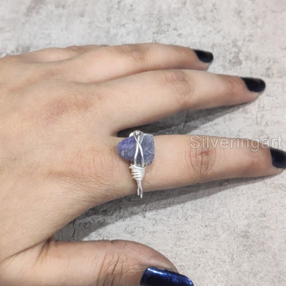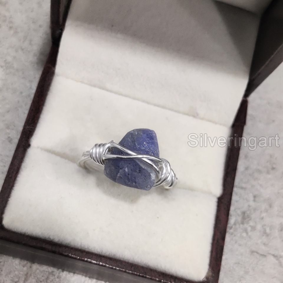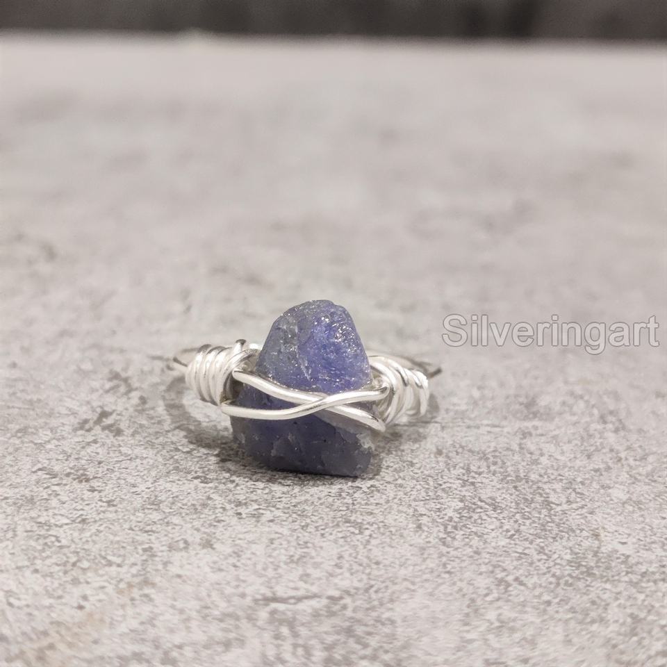 แหวนเงินแท้ 925 ประดับพลอยแทนซาไนต์ดิบธรรมชาติ สำหรับผู้หญิง แหวนทำมือ ดีไซน์วงลวด ประดับพลอยประจำเดือนธันวาคม