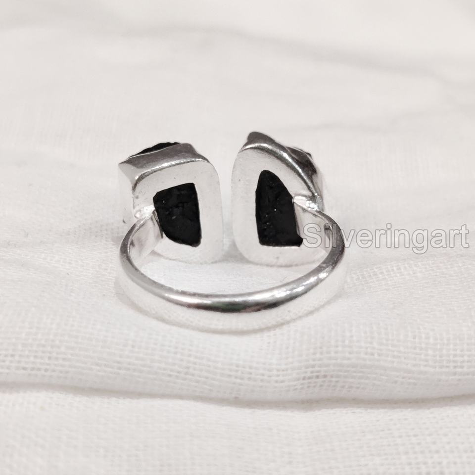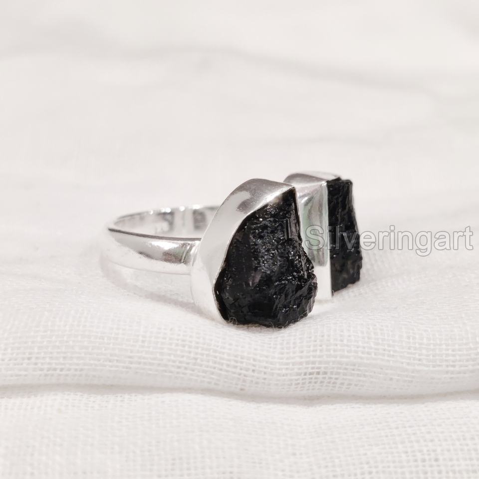 เครื่องประดับหินหยาบแหวนสตรีอัญมณีทัวร์มาลีนธรรมชาติสีดำหินประจำเดือน925แหวนเงินสเตอร์ลิง