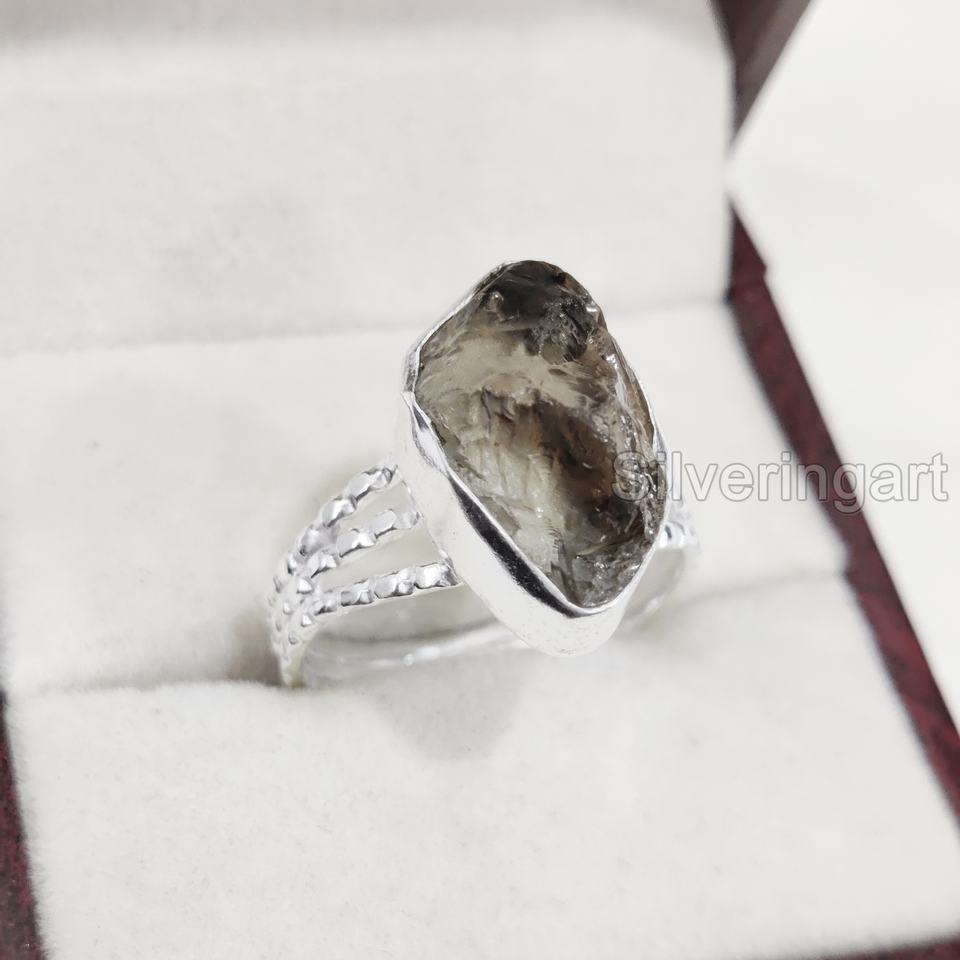 แหวนผู้หญิงประดับพลอยควอตซ์สโมคกี้ดิบธรรมชาติ วงแหวนลายจุด 3 จุด แหวนเงินแท้ 925 สำหรับเทศกาลคริสต์มาส
