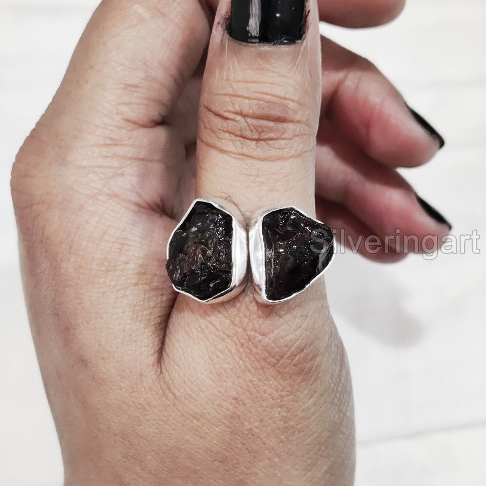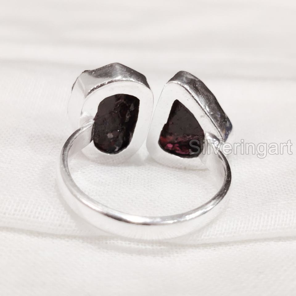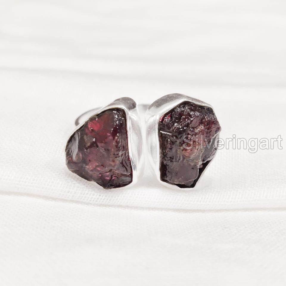 เครื่องประดับหินหยาบแหวนสำหรับผู้หญิงพลอยโกเมนธรรมชาติพลอยดิบที่อยู่ในสภาพบริสุทธิ์พลอยสองชั้นอัญมณี925แหวนเงินสเตอร์ลิง