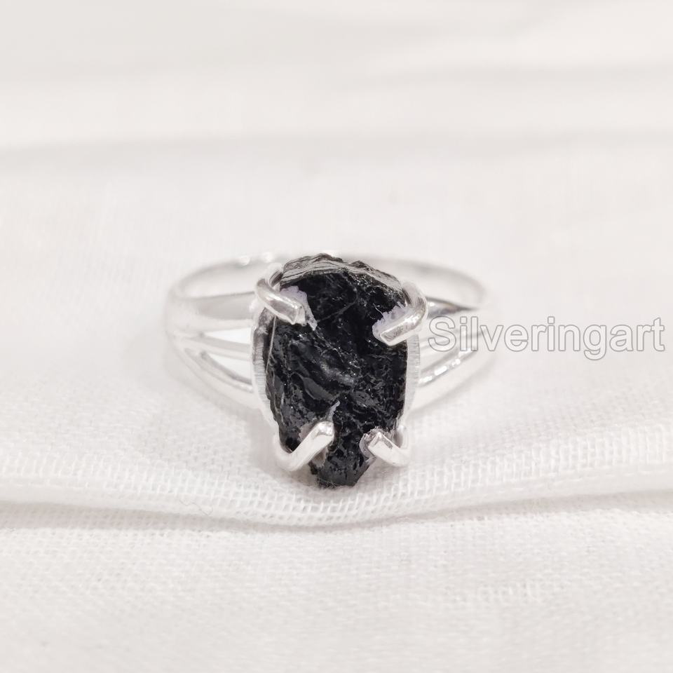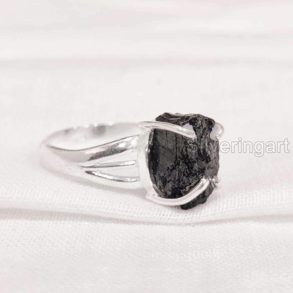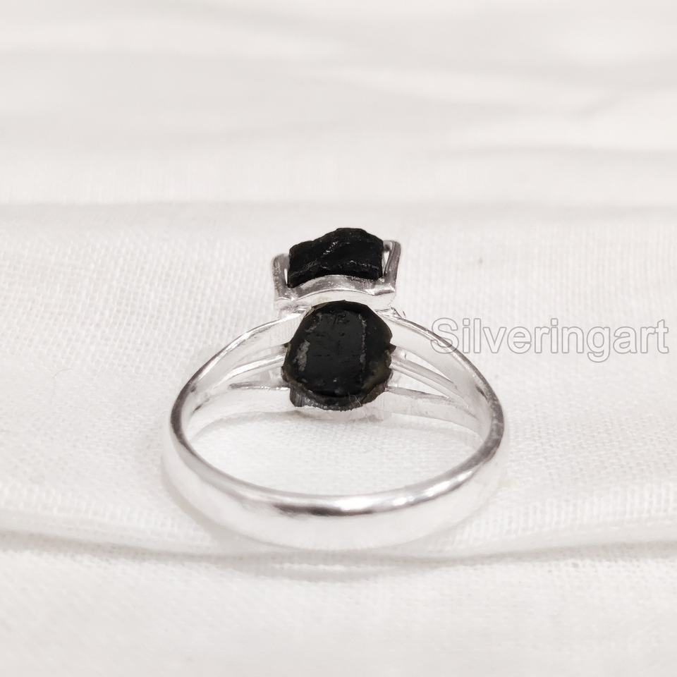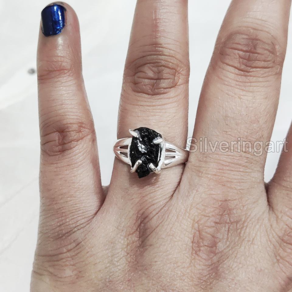 เครื่องประดับหินหยาบแหวนผู้หญิงพลอยทัวร์มาลีนธรรมชาติสีดำแหวนยิปซีโบฮีเมียน925แหวนเงินสเตอร์ลิง