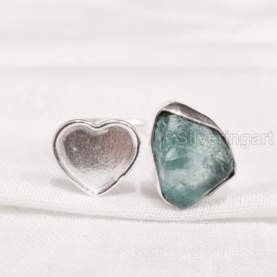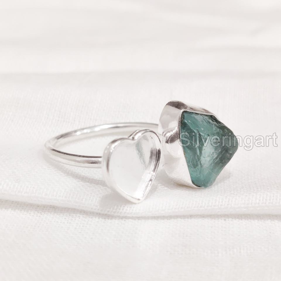 แหวนหินดิบสำหรับผู้หญิง แหวนพลอยอะพาไทต์สีน้ำเงินธรรมชาติ แหวนหินประจำวันเกิดรูปหัวใจ แหวนเงินแท้ 925 ปรับขนาดได้