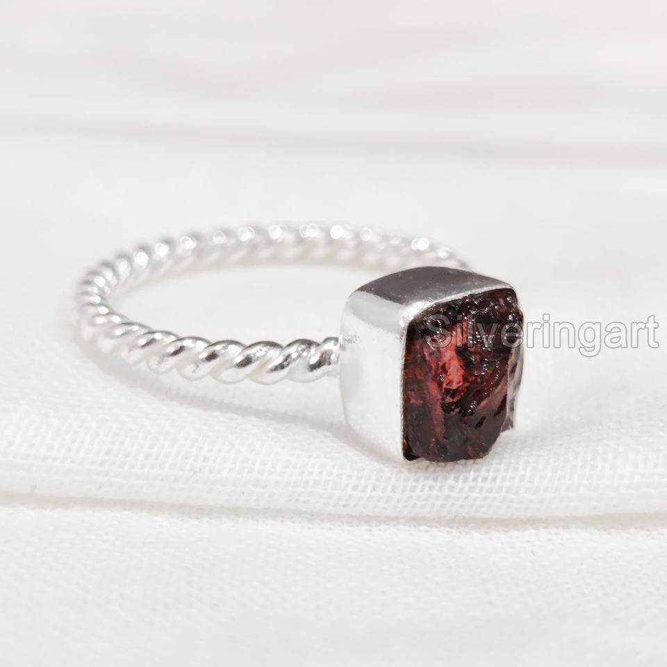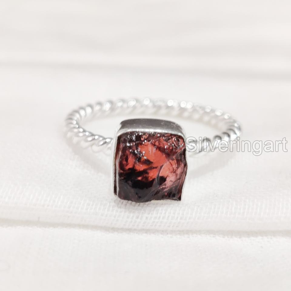 เครื่องประดับหินหยาบแหวนโกเมนธรรมชาติสำหรับผู้หญิงพลอยโกเมนแบบดิบจากหินประจำเดือนมาแล้ววงแหวนเงินสเตอร์ลิง925