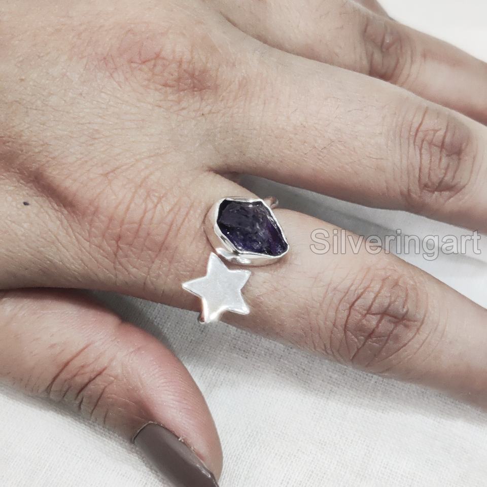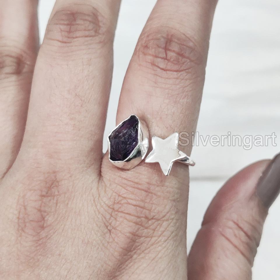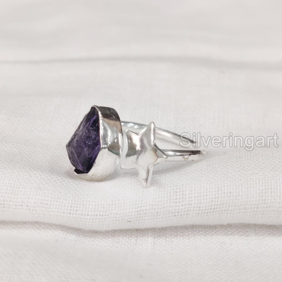 แหวนพลอยดิบธรรมชาติสำหรับผู้หญิง พลอยแอมะทิสต์ แหวนดาวประจำเดือนกุมภาพันธ์ แหวนเงินแท้ 925