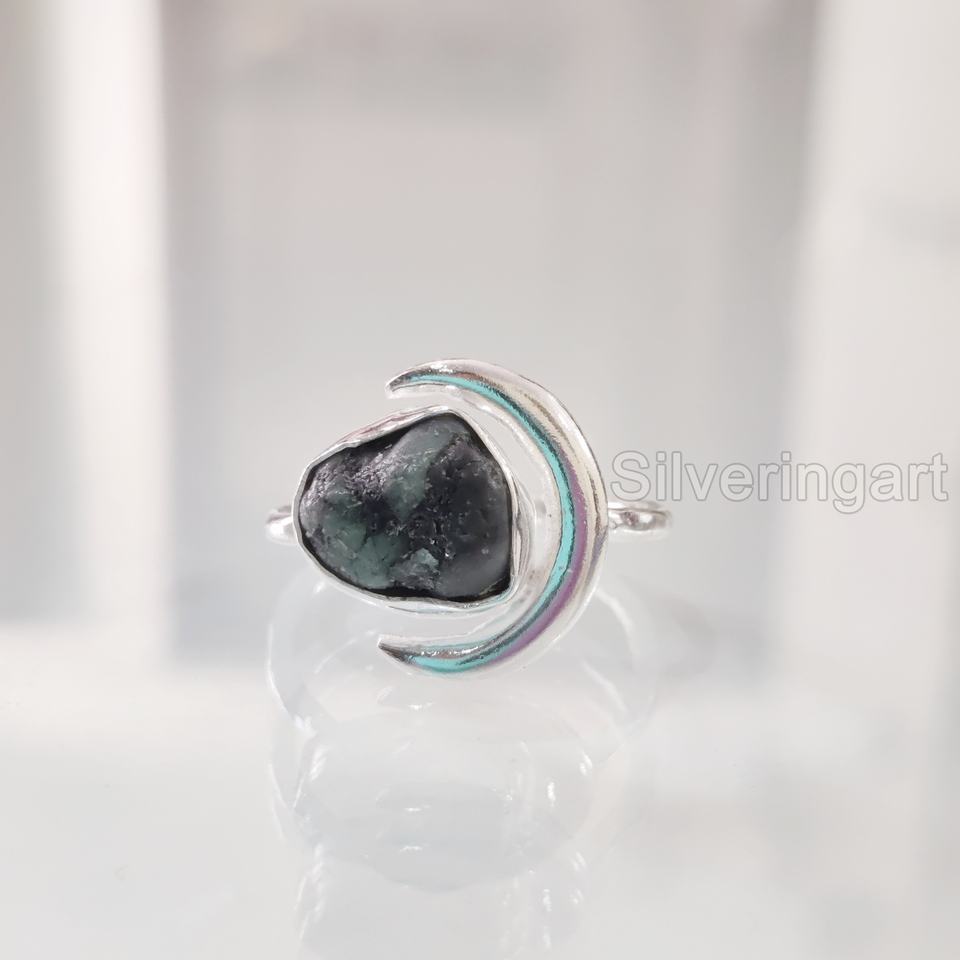 เครื่องประดับหินหยาบแหวนสตรีอัญมณีมรกตดิบจากธรรมชาติอาจเป็นแหล่งกำเนิดแหวนพระจันทร์เสี้ยววงเดือนเครื่องประดับแหวนเงินสเตอร์ลิง925