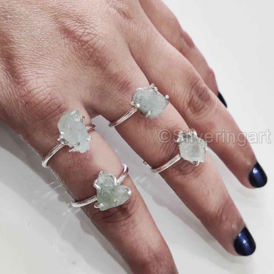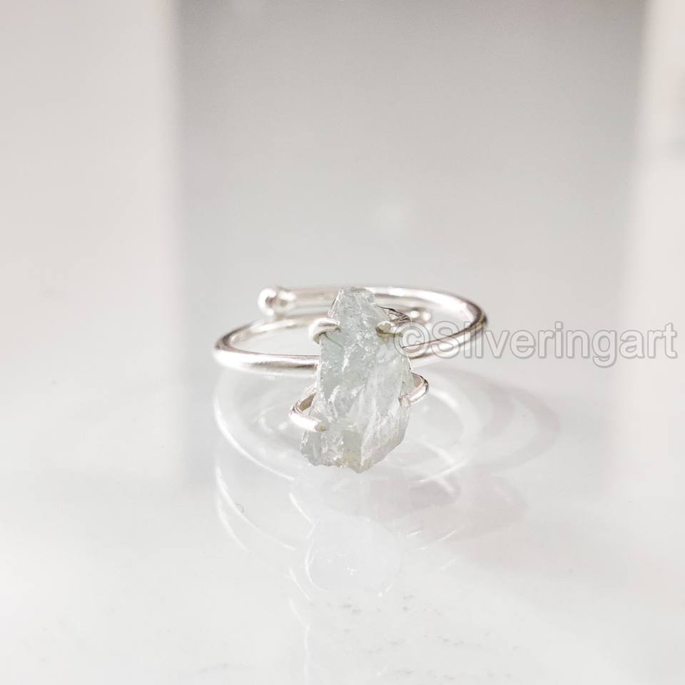 เครื่องประดับหินหยาบเครื่องประดับผู้หญิงแหวนพลอยอะความารีนจากธรรมชาติพลอยอัญมณีอัญมณีสำหรับเดือนมีนาคมเครื่องประดับแหวนค้อน925แหวนเงินสเตอร์ลิง