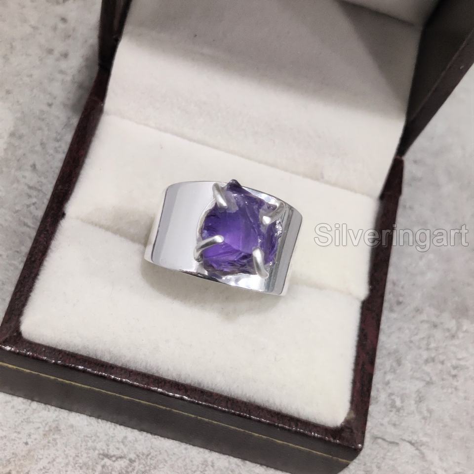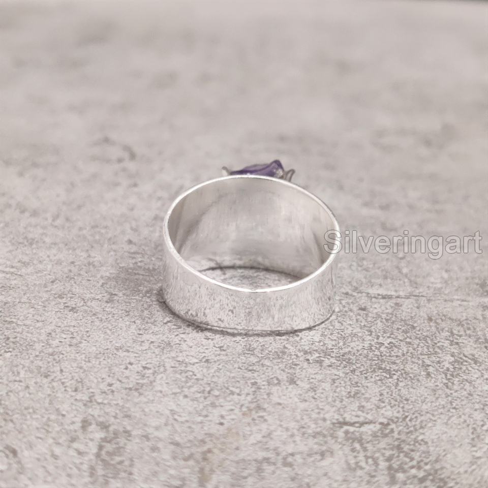 เครื่องประดับหินหยาบสำหรับผู้หญิงแหวนพลอยอเมทิสต์ธรรมชาติพลอยอเมทิสต์พลอยสไตล์วินเทจเครื่องประดับหินกว้าง925แหวนเงินสเตอร์ลิง