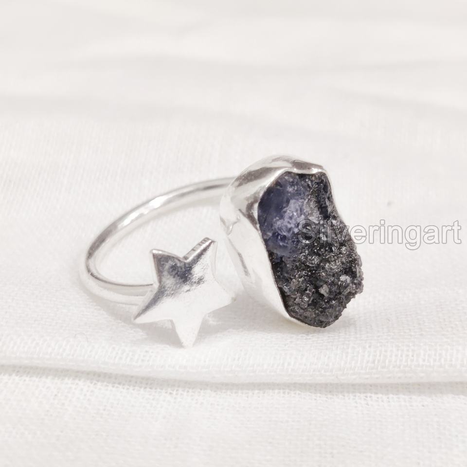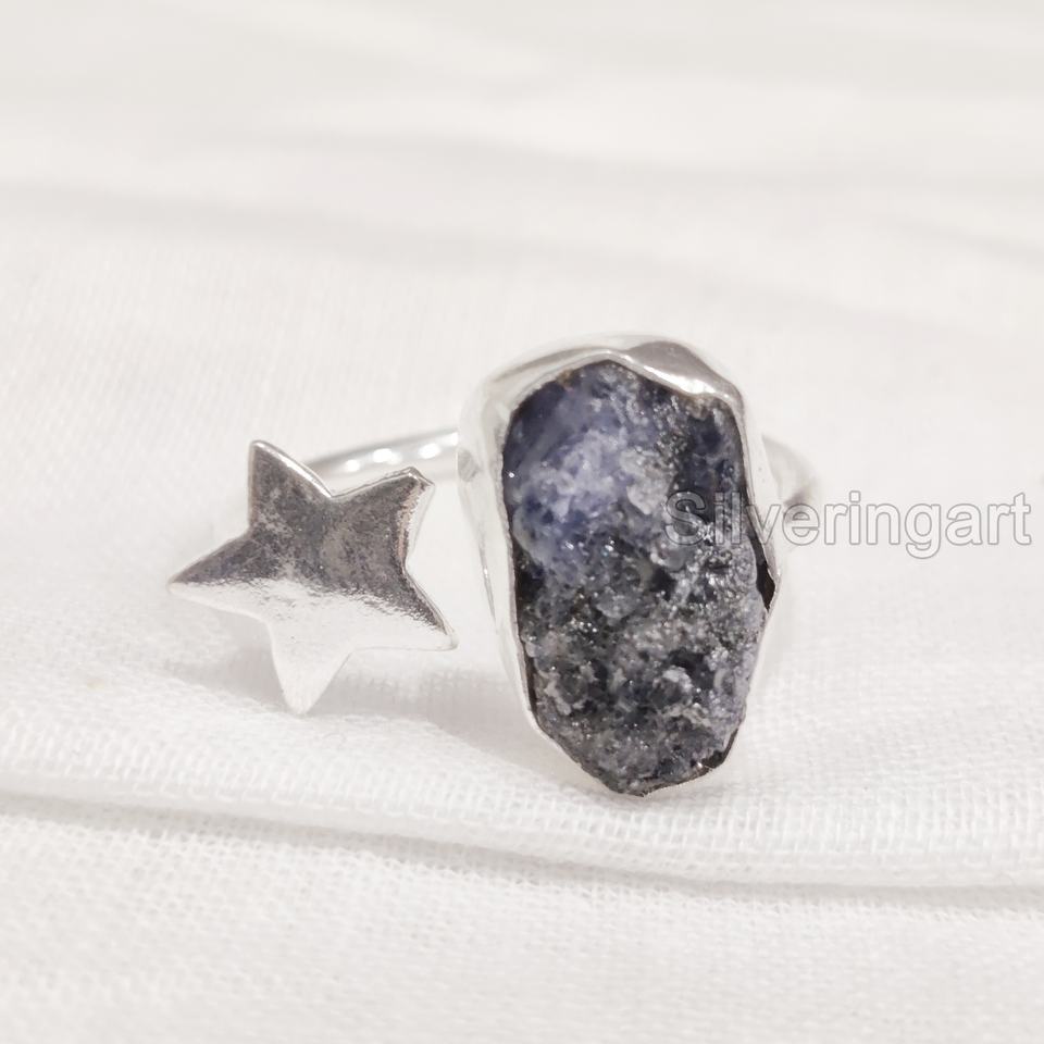 Rough Stone Jewelry Womens Ring Natural Raw Blue Sapphire Gemstone September Birthstone Star Ring Party 925 Sterling Silver Ring