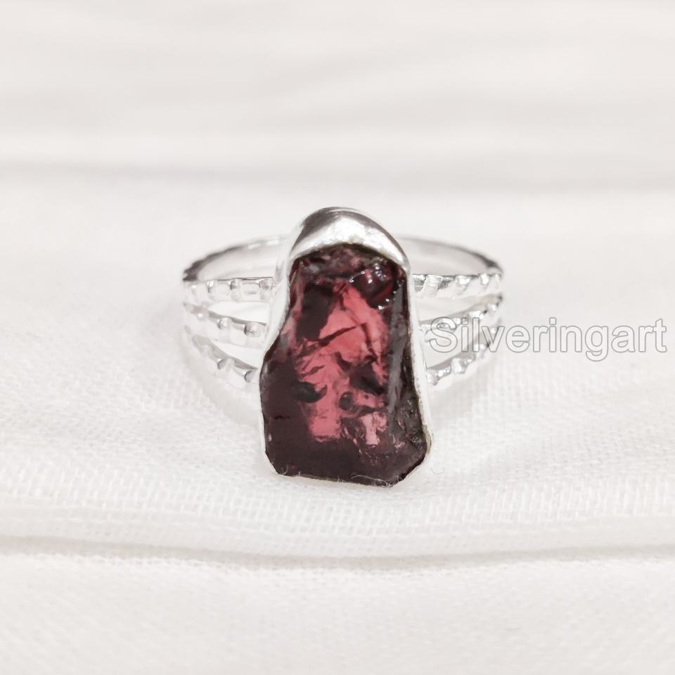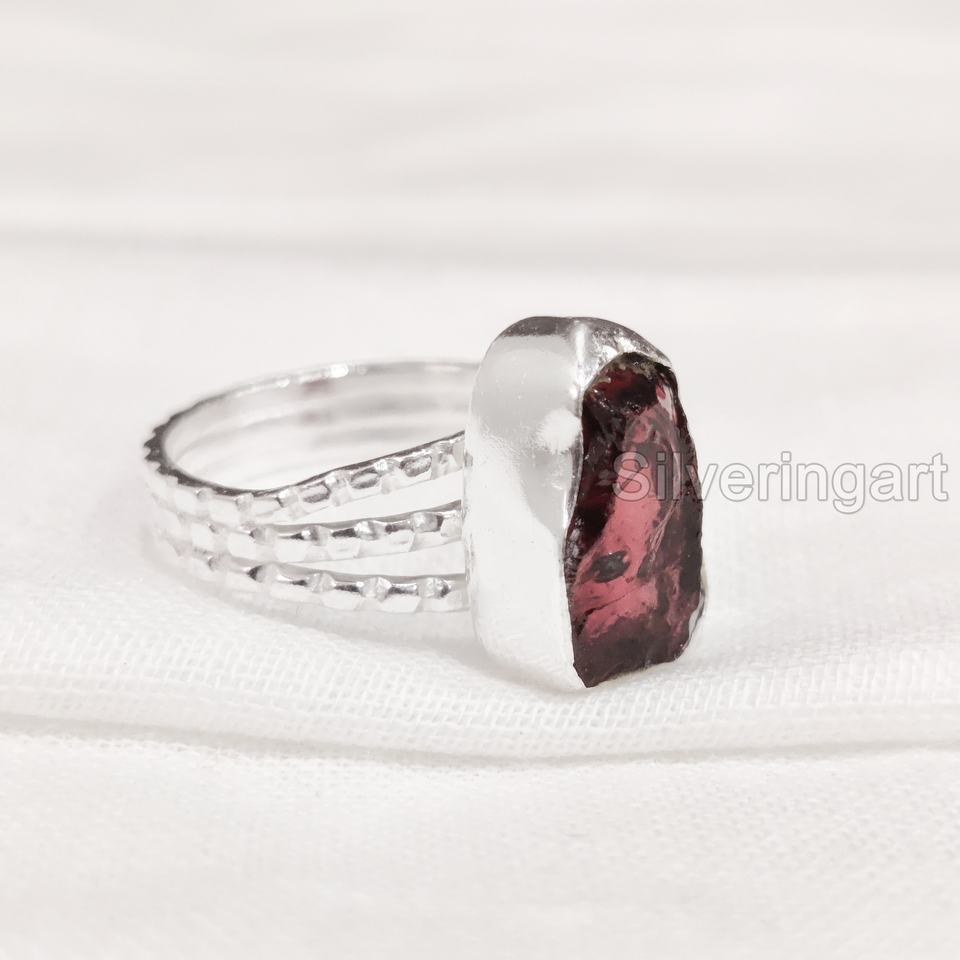 เครื่องประดับหินหยาบผู้หญิงแหวนโกเมนธรรมชาติพลอยดิบ janawuary birthary band doted เครื่องประดับปาร์ตี้925แหวนเงินสเตอร์ลิง