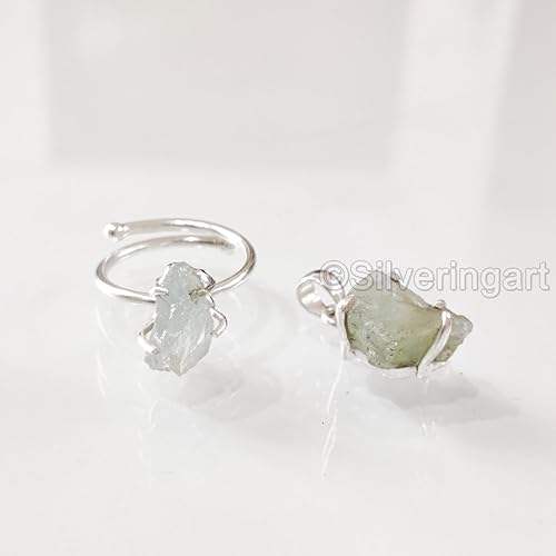 ชุดเครื่องประดับผู้หญิงแบบดิบ ประดับพลอยอะความารีนธรรมชาติ ประจำเดือนมีนาคม ทำด้วยมือ เครื่องประดับเงินแท้ 925 ชุดจี้และแหวน