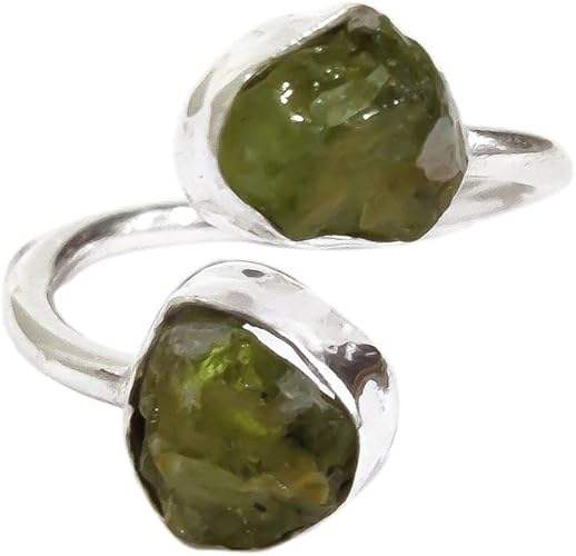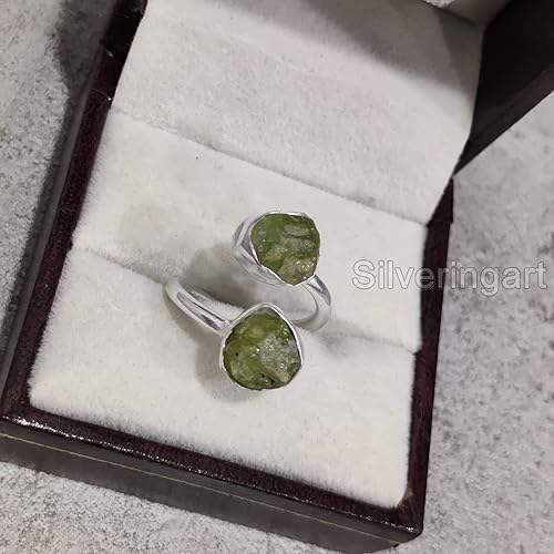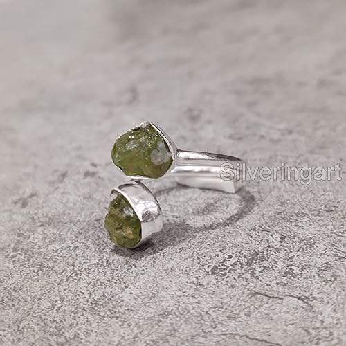 แหวนผู้หญิงดีไซน์เรียบง่าย ประดับพลอยเพอริดอตธรรมชาติ ประจำเดือนสิงหาคม แหวนปรับขนาดได้ 2 เม็ด ทำด้วยมือ เครื่องประดับเงินแท้ 925
