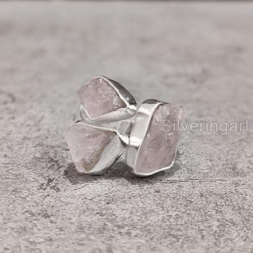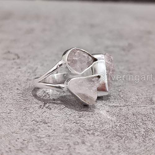 แหวนผู้หญิงดีไซน์เรียบง่าย ประดับโรสควอตซ์ธรรมชาติ หินประจำเดือนเมษายน แหวนสามเม็ด ปรับขนาดได้ ทำด้วยมือ เครื่องประดับเงินแท้ 925