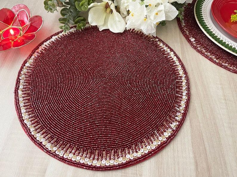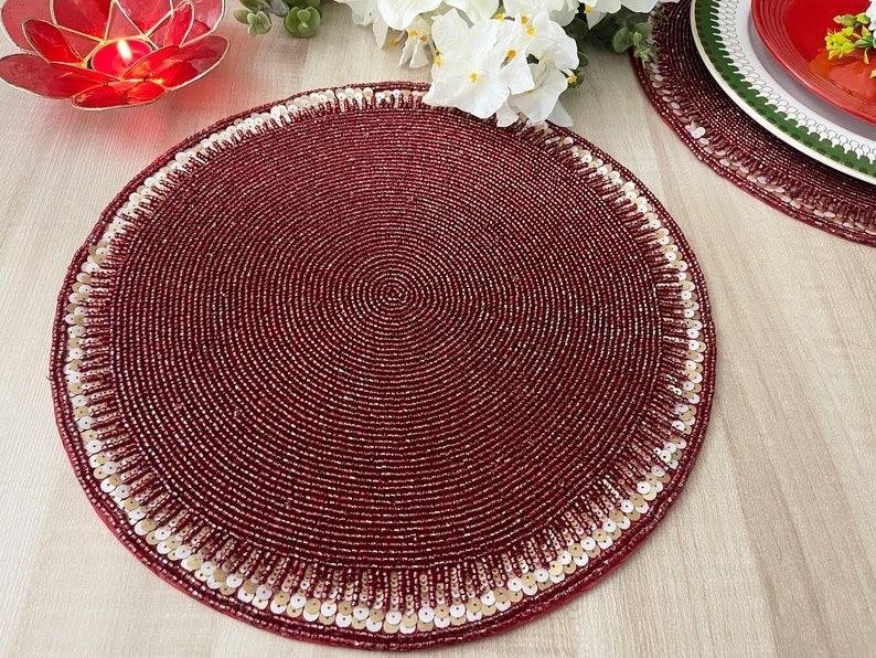 แผ่นรองจานทรงกลมประดับลูกปัดสำหรับตกแต่งโต๊ะอาหาร แผ่นรองจานและแผ่นรองอื่นๆ ที่หรูหรา