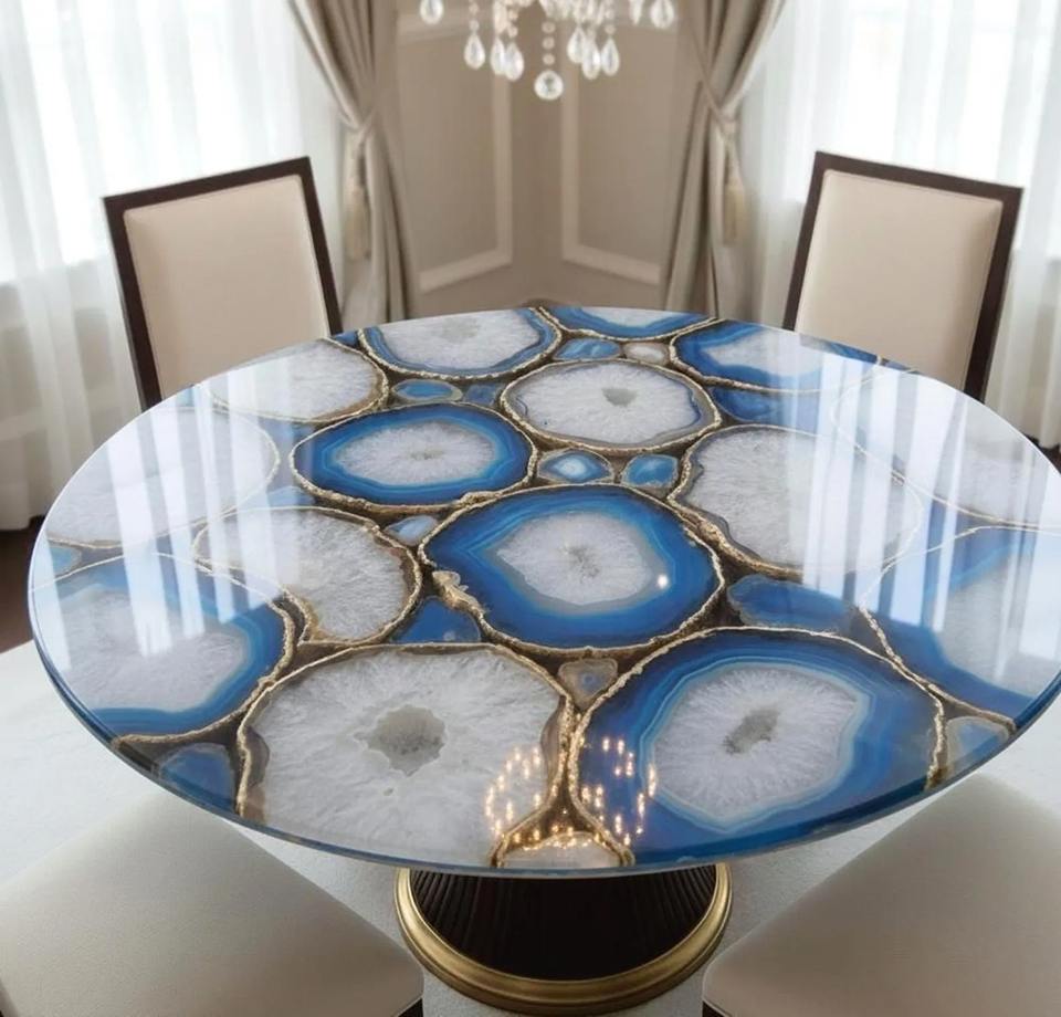 ท็อปโต๊ะกาแฟหินอาเกตสีน้ำเงินทรงกลม โต๊ะอัญมณีหรูหรา เฟอร์นิเจอร์อาเกตธรรมชาติ งานแฮนด์เมด ของตกแต่งบ้าน