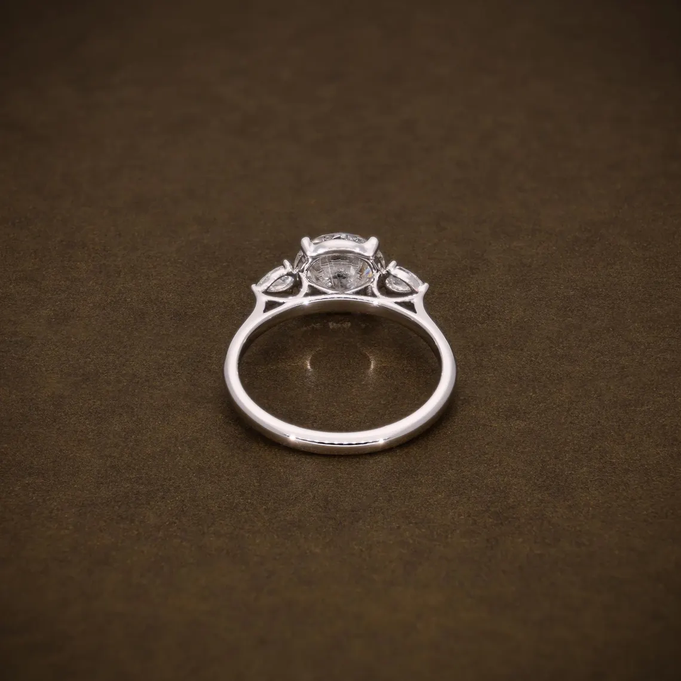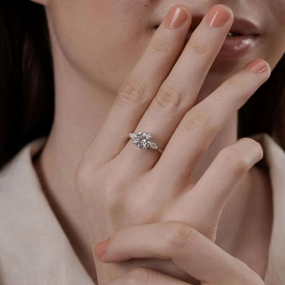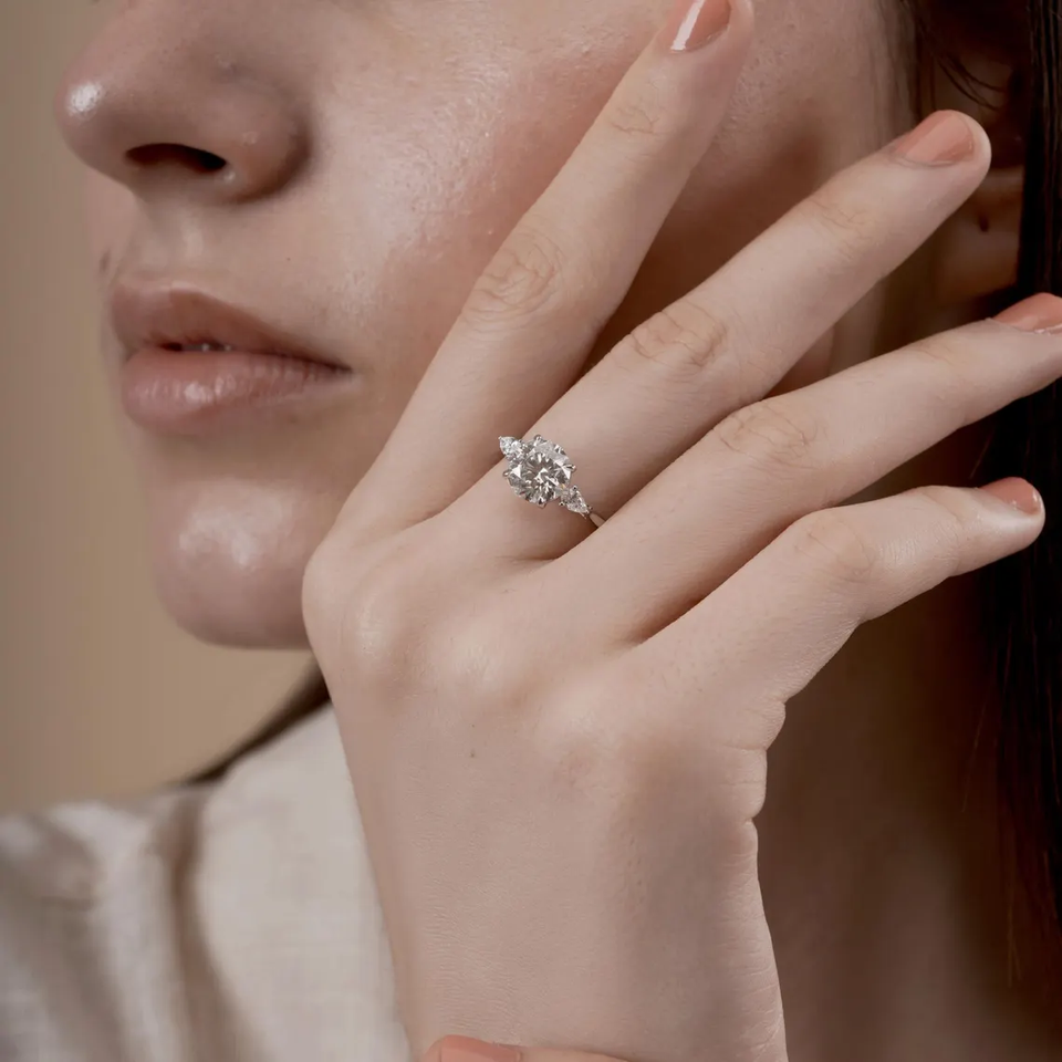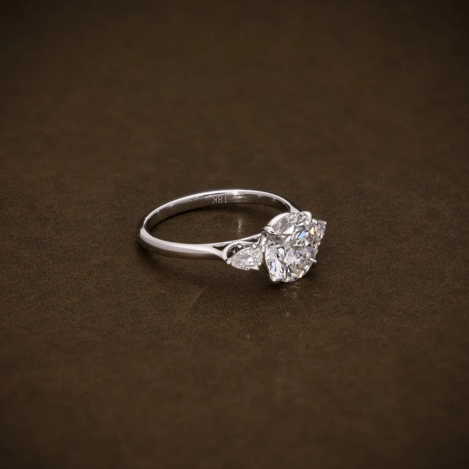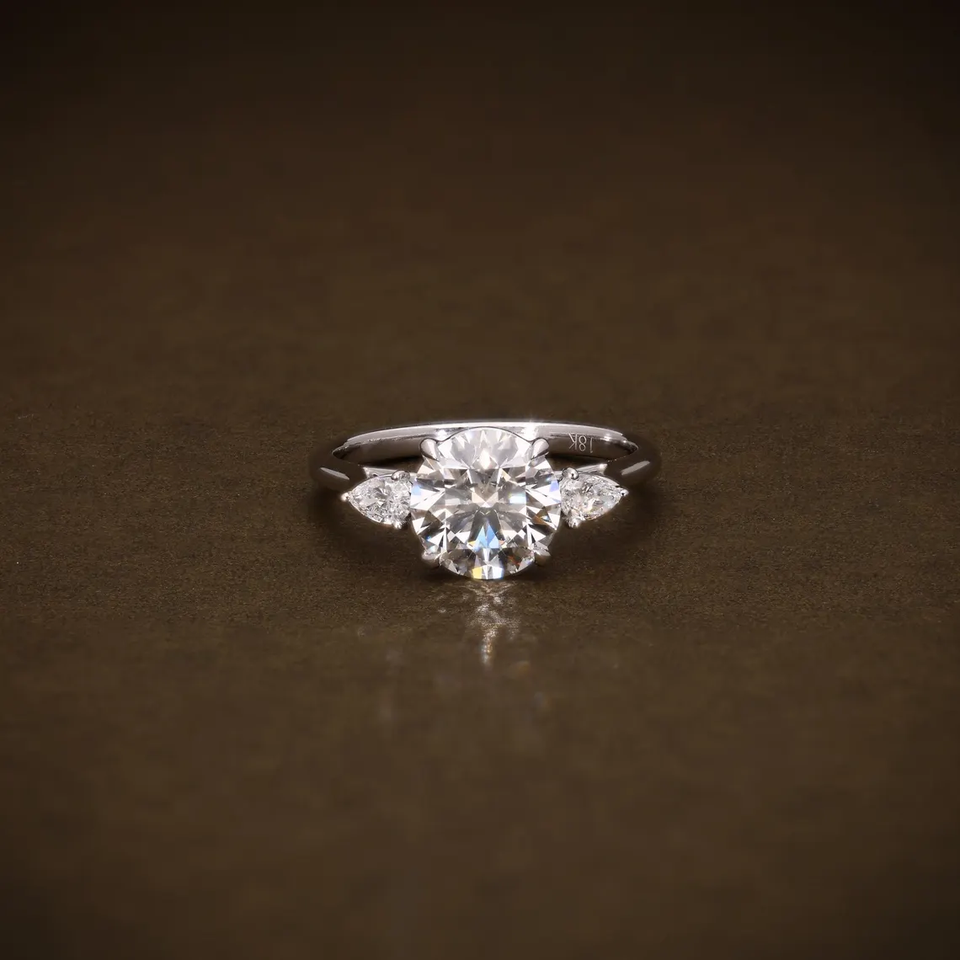 แหวนเพชรทรงกลมเจียระไนแบบบริลเลียนท์ ผลิตในห้องปฏิบัติการ ตัวเรือนทองคำขาว 18K แบบตัน ประดับเพชรทรงหยดน้ำด้านข้างสามเม็ด