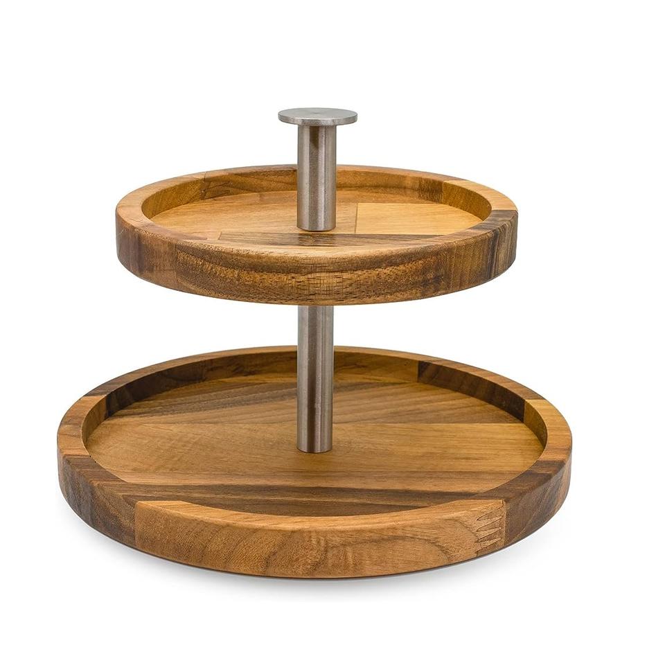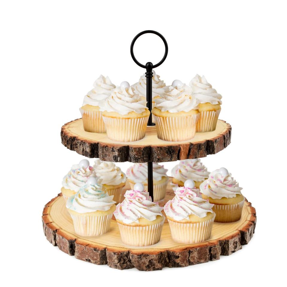ที่ตั้งโชว์เค้กคัพเค้กทรงกลม2ชั้นพร้อมจานไม้มะม่วงและฐานสีธรรมชาติสำหรับบ้านงานแต่งงาน