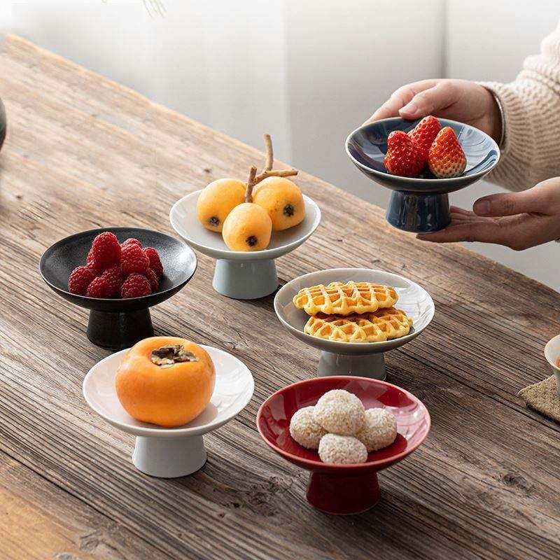 จานเซรามิกทรงกลมถาดใส่ผลไม้ขนาดเล็กถาดเครื่องดื่มทรงสูงถาดใส่ผลไม้แห้งถาดวางเค้กถาดโชว์