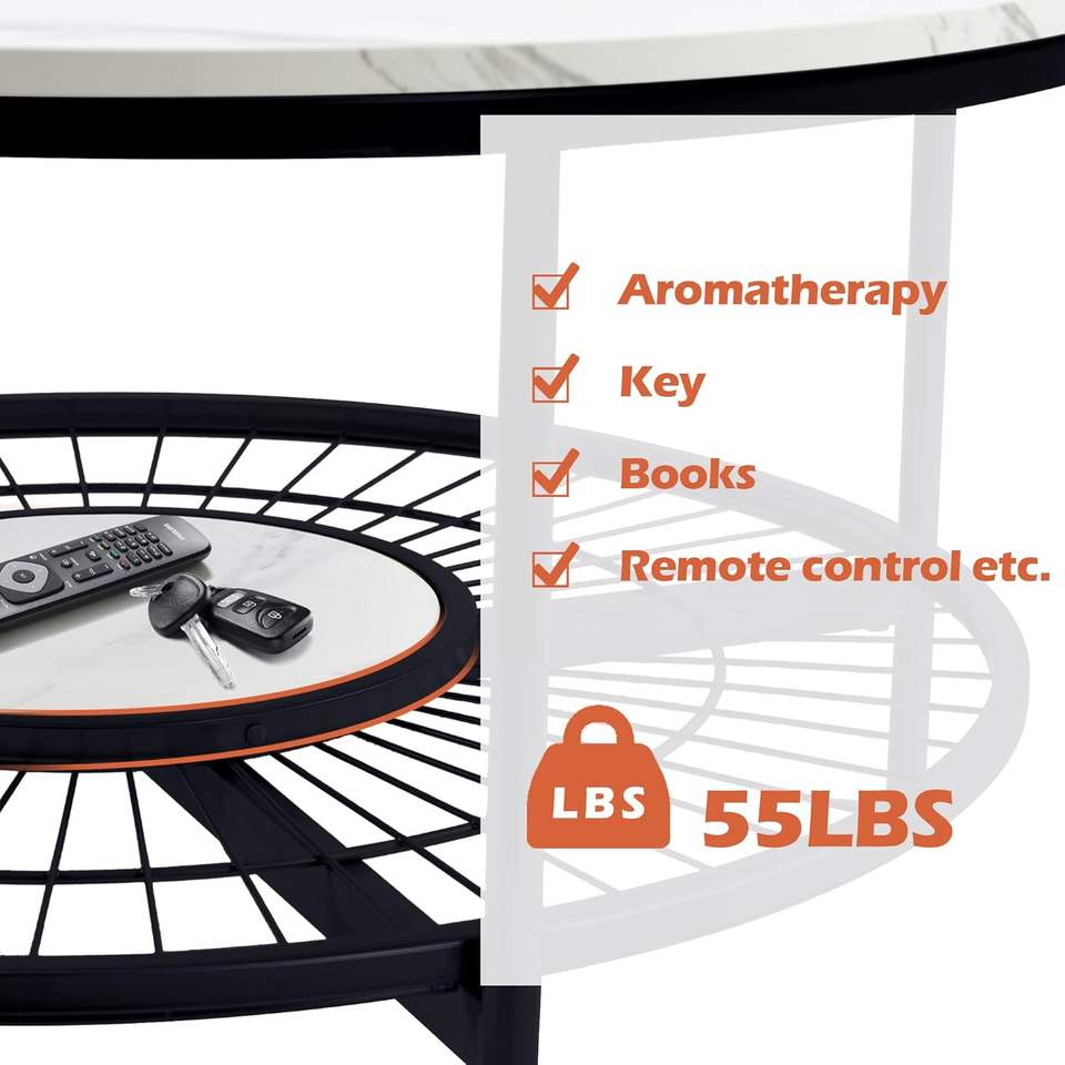 โต๊ะกาแฟทรงกลมสำหรับห้องนั่งเล่น ดีไซน์รูปทรงพระอาทิตย์ทันสมัย พร้อมที่เก็บของแบบเปิด ท็อปไม้หินอ่อน โครงโลหะแข็งแรง สีขาวดำ
