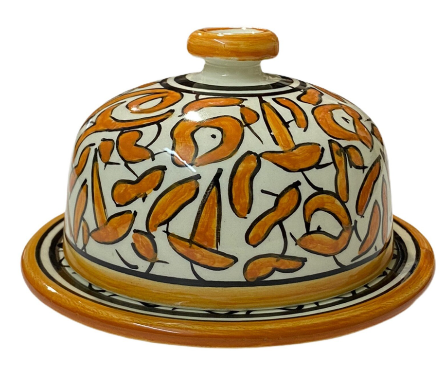 จานเนยเซรามิกทรงกลมทาสีด้วยมือพร้อมฝาปิดจานโมร็อกโกและเคลือบเซรามิกที่ทำด้วยมือสามารถกำหนดเองได้