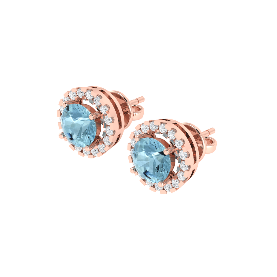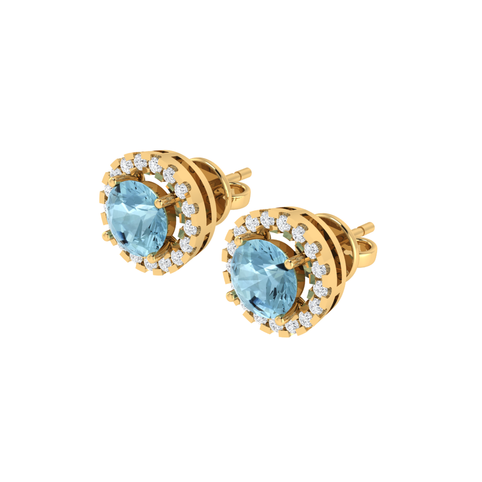 ต่างหูทรงกลมประดับพลอยอะความารีน 2 เม็ด และเพชรคิวบิกเซอร์โคเนีย 34 เม็ด ชุบทองบนเงินแท้ น้ำหนัก 2.5 กรัม
