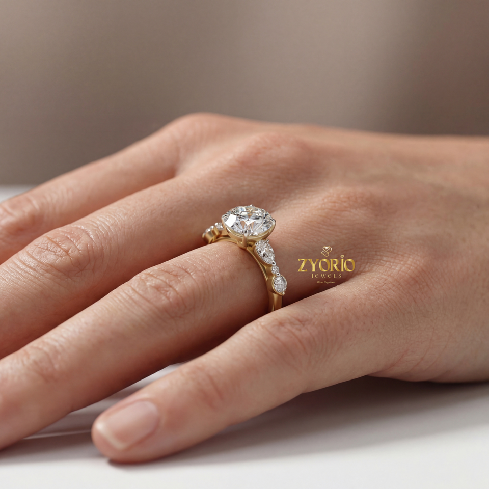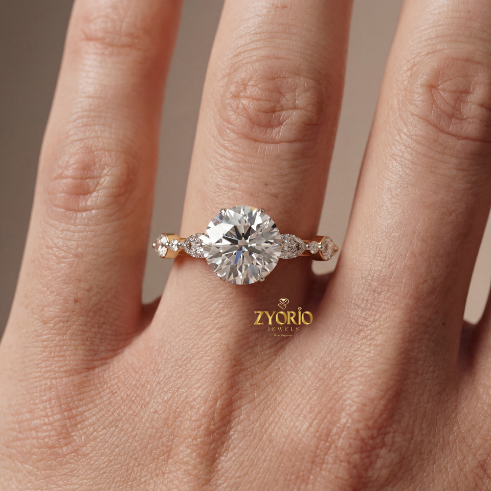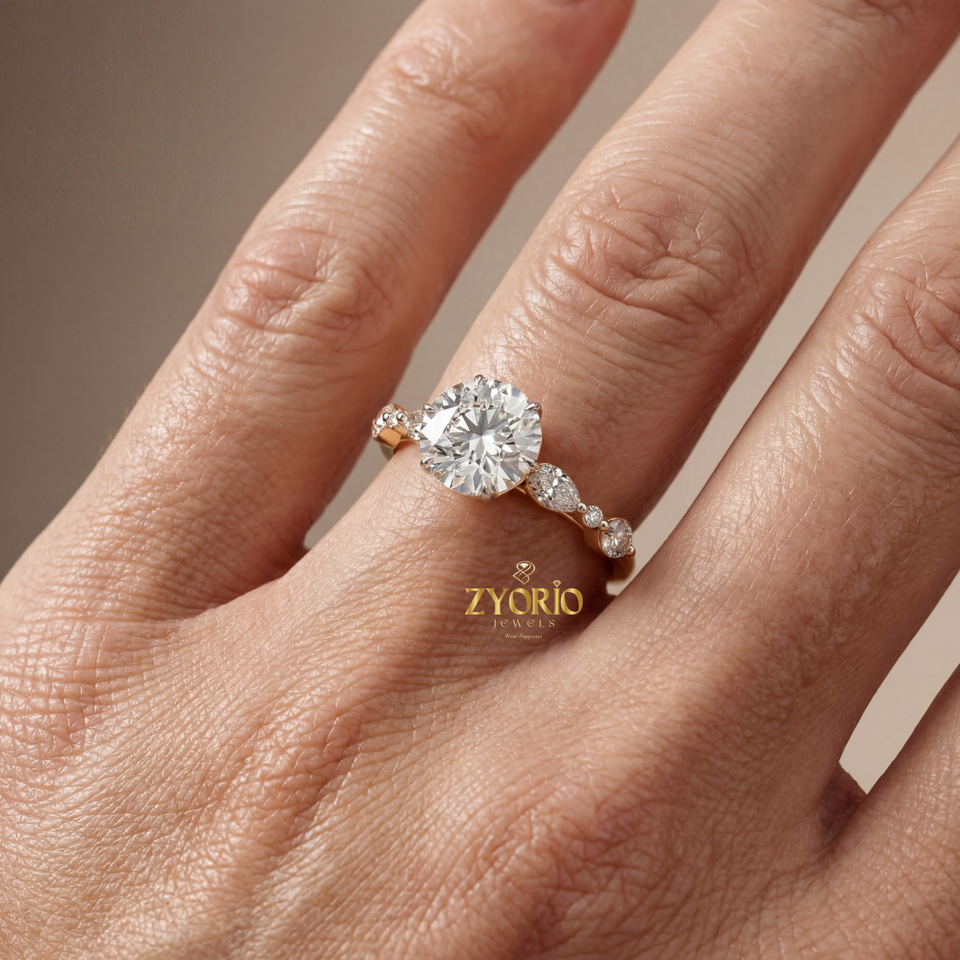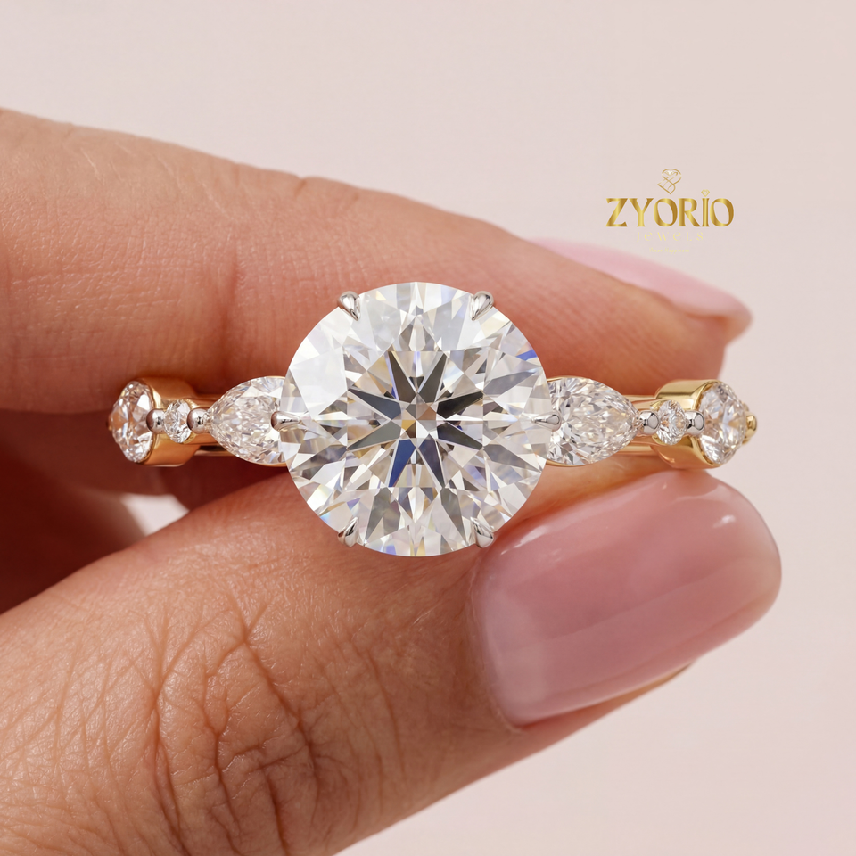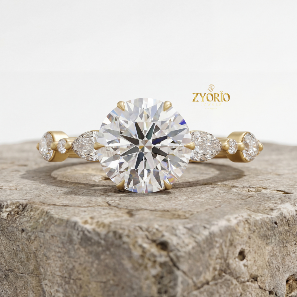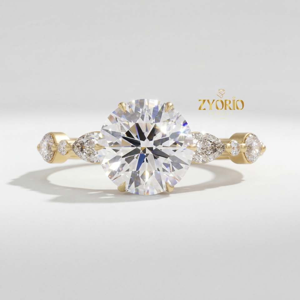 แหวนหมั้นเพชรทรงกลมเพาะเลี้ยงในห้องปฏิบัติการ 1.92 กะรัต พร้อมเพชรทรงมาร์คีส์และทรงกลมด้านข้าง เงินแท้ 925 สำหรับงานแต่งงาน