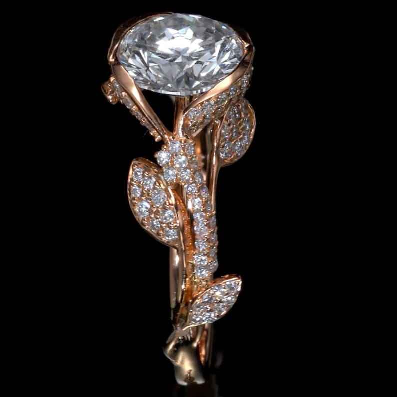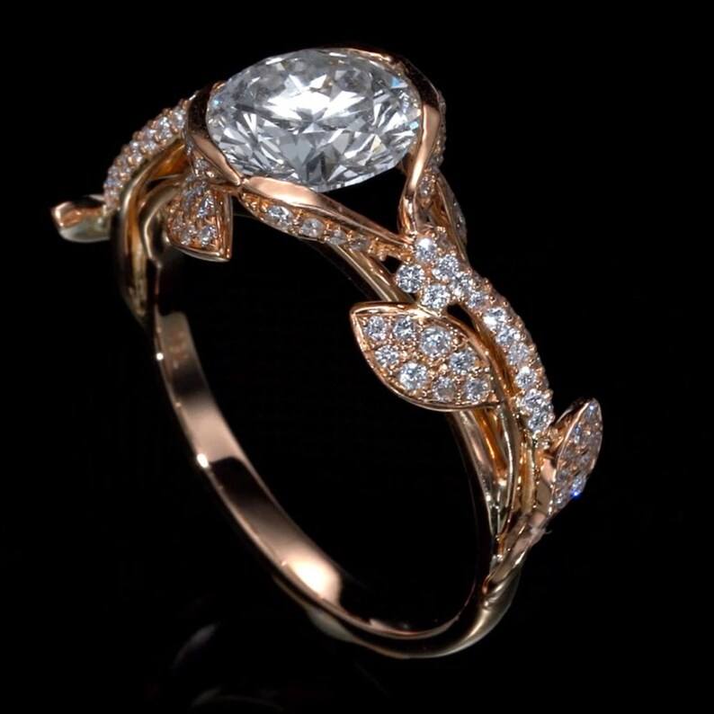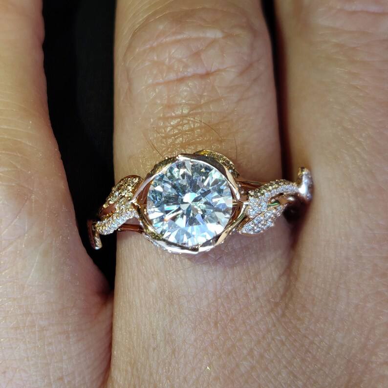 แหวนใบไม้ประดับมอสซาไนต์ทรงกลม แหวนสัญญาเงินแท้ 925 ชุบทอง ดีไซน์คลาสสิกสำหรับงานแต่งงานและวันครบรอบสำหรับผู้หญิง