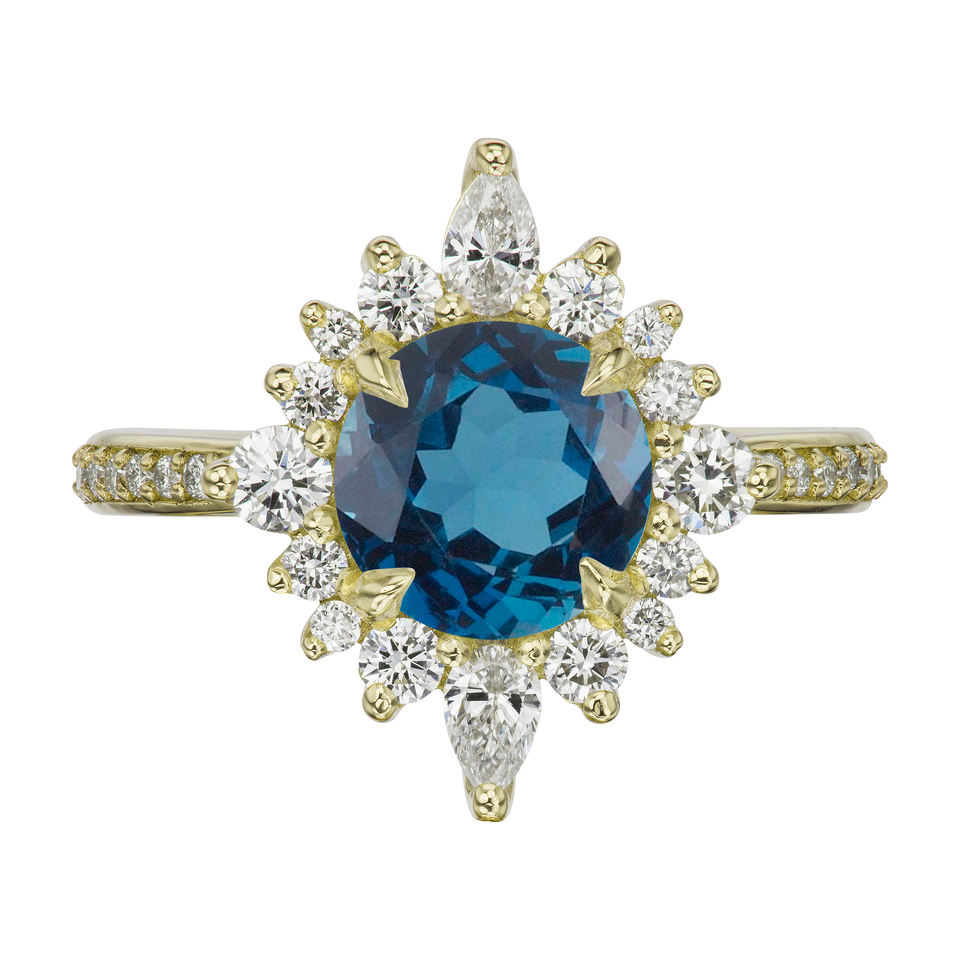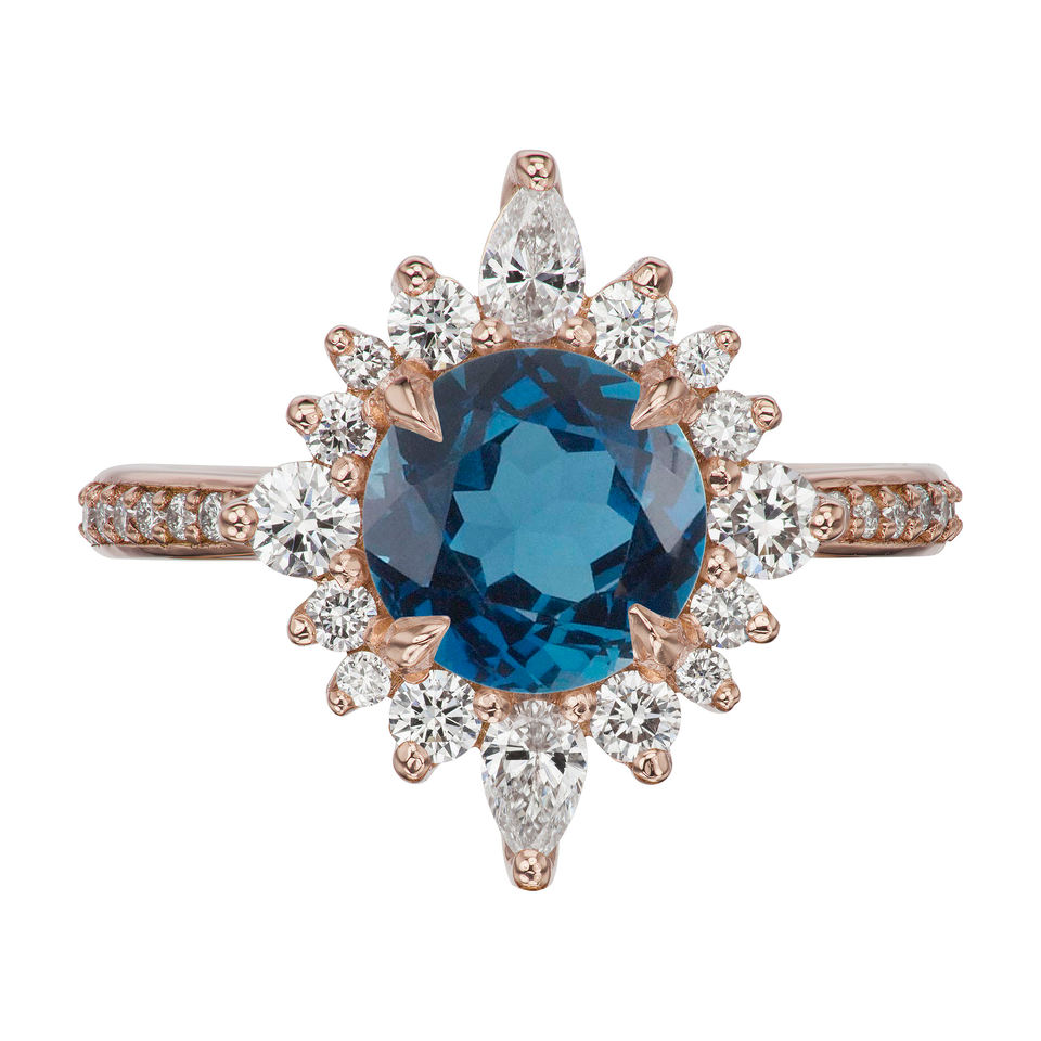 กลมตัดธรรมชาติลอนดอนสีฟ้าบุษราคัมกับได้รับการรับรองแหวนหมั้นเพชรคลัสเตอร์แหวนทอง18K แท้สำหรับผู้หญิงเครื่องประดับชั้นดี