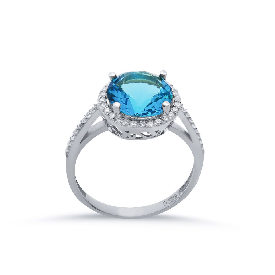 แหวนเงินแท้ 925 ชุบโรเดียม ดีไซน์ทรงกลม ประดับด้วยพลอยเทอร์ควอยซ์ทรงกลุ่ม งานแฮนด์เมดจากตุรกี เหมาะสำหรับงานแต่งงาน