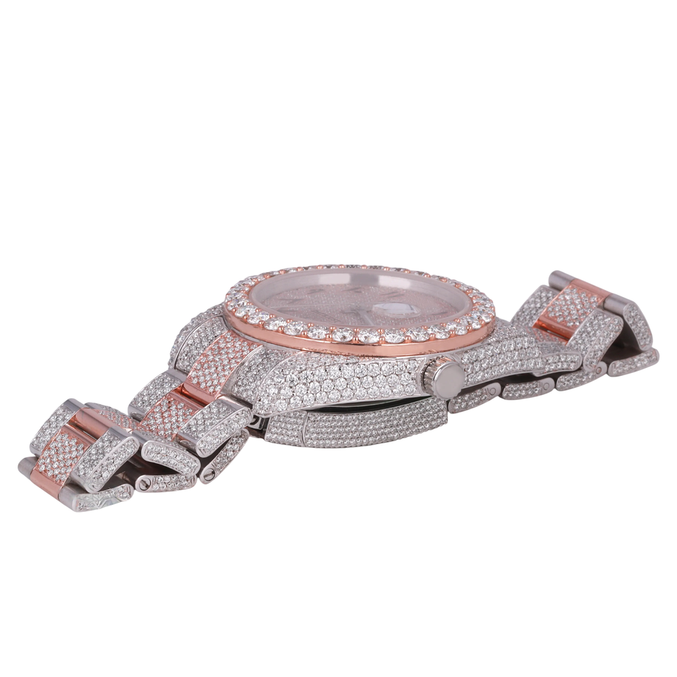 นาฬิกาสแตนเลสสำหรับผู้ชายแฟชั่นหน้าปัดทรงกลมประดับเพชรสีโรสโกลด์และเงินออกแบบได้ตามต้องการ