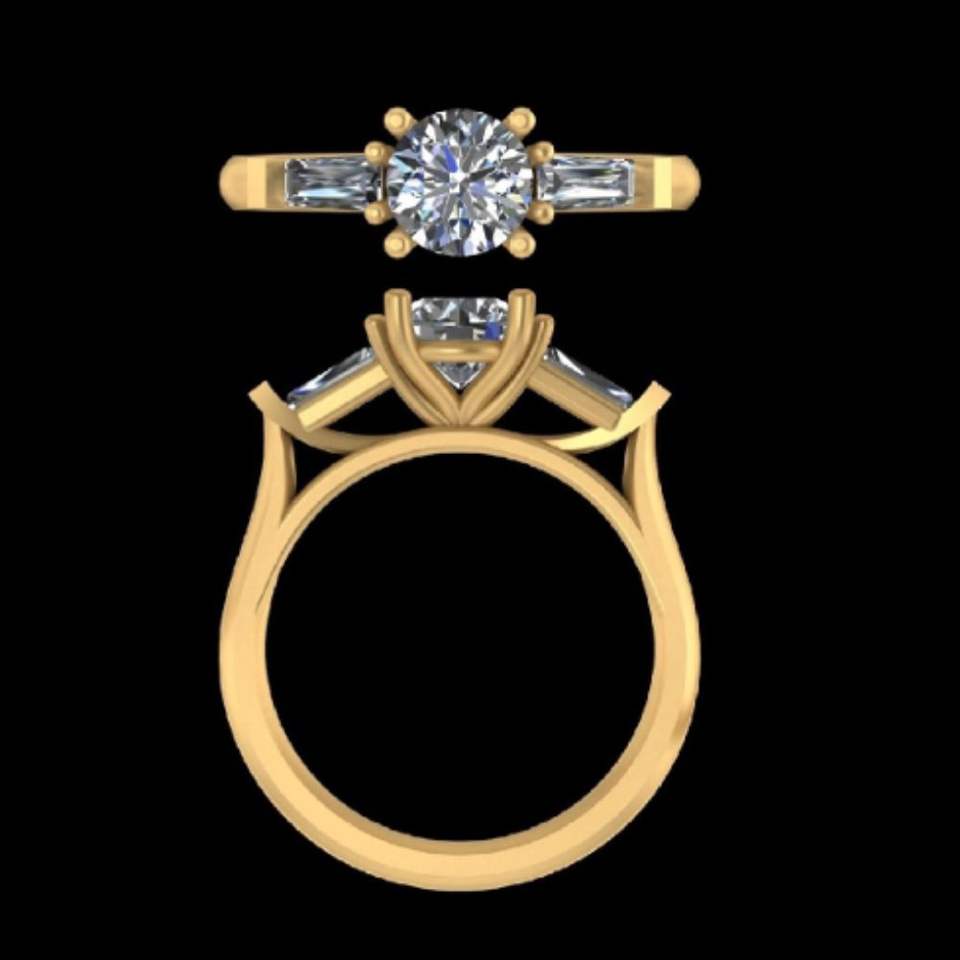 แหวนหมั้นเพชรทรงกลมสามเม็ด ประดับด้วยเพชรทรงบาแกตต์ด้านข้าง ทองคำสีเหลือง แหวนแต่งงานแบบ Cathedral เครื่องประดับเจ้าสาว