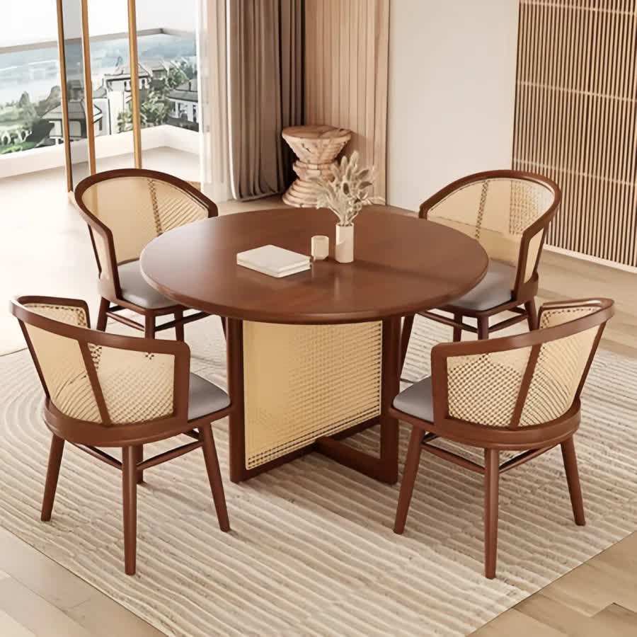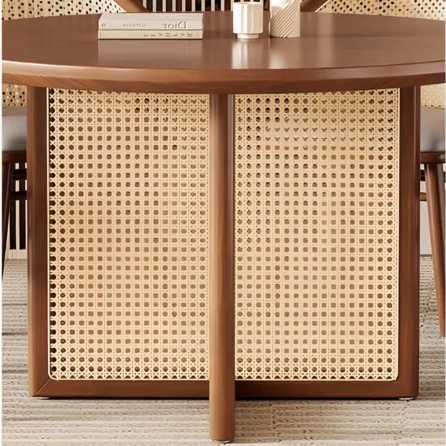โต๊ะรับประทานอาหารทรงกลมทันสมัย ทำจากโครงไม้สักแท้ พร้อมหวายและวัสดุคุณภาพสูง สำหรับใช้ภายในและภายนอกอาคาร