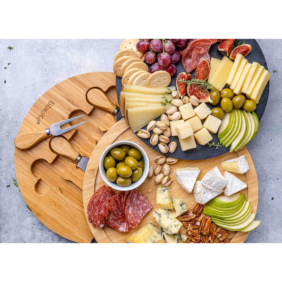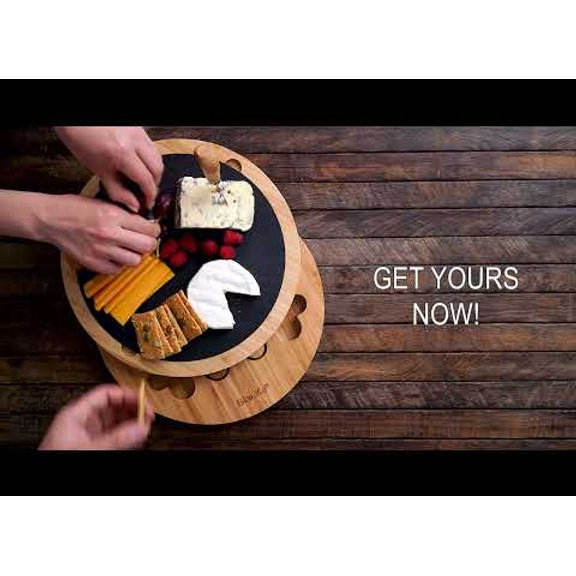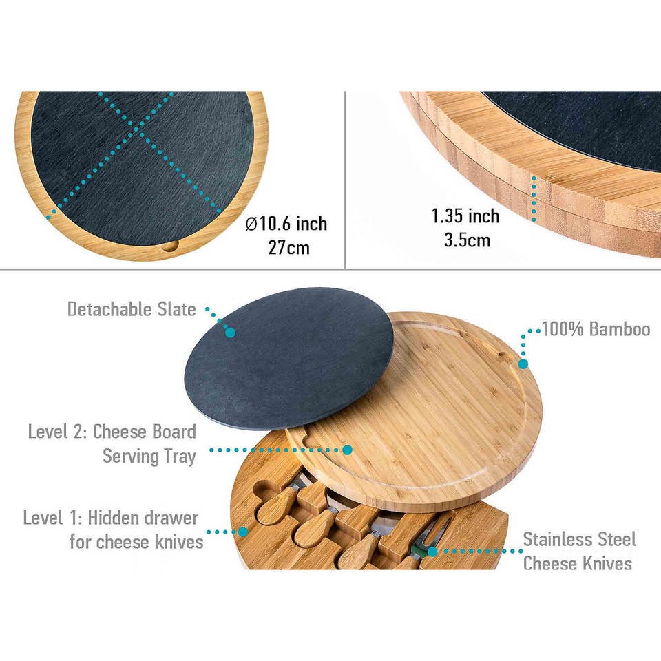 เขียงไม้ไผ่ทรงกลมรักษ์โลก ปราศจากเศษไม้ พร้อมชุดมีดหมุนได้ แผ่นหินชนวนถอดออกได้สำหรับหั่นชีสและสับอาหาร