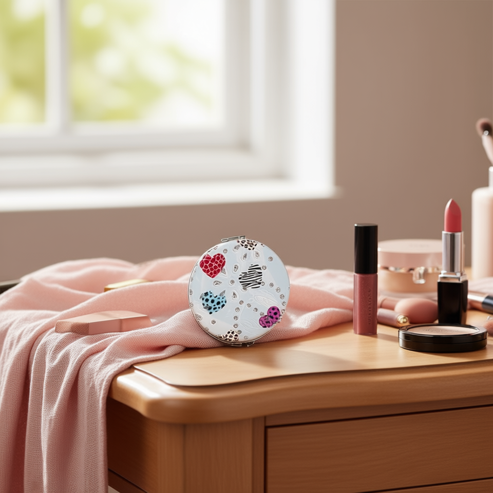 Round Heart Leopard Print Pocket Mirror 6.3Cm With Rhinestones For Women Makeup Travel Use