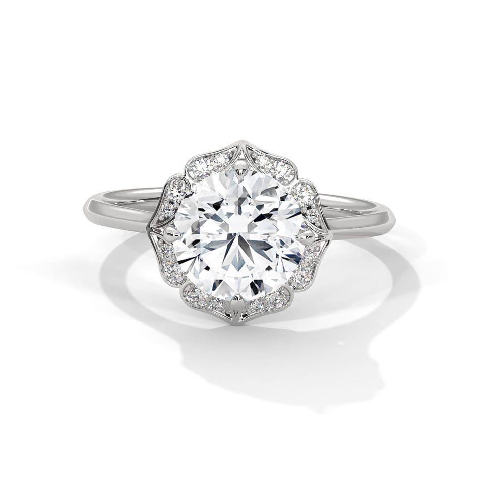 แหวนหมั้นเพชรทรงกลมแบบซ่อนรูปทรงฮาโล ผลิตในห้องปฏิบัติการ ตัวเรือนทองคำเหลือง – แหวนเพชรเจ้าสาวทรงโซลิแทร์แบบ Cathedral ดีไซน์หรูหราสำหรับผู้หญิง