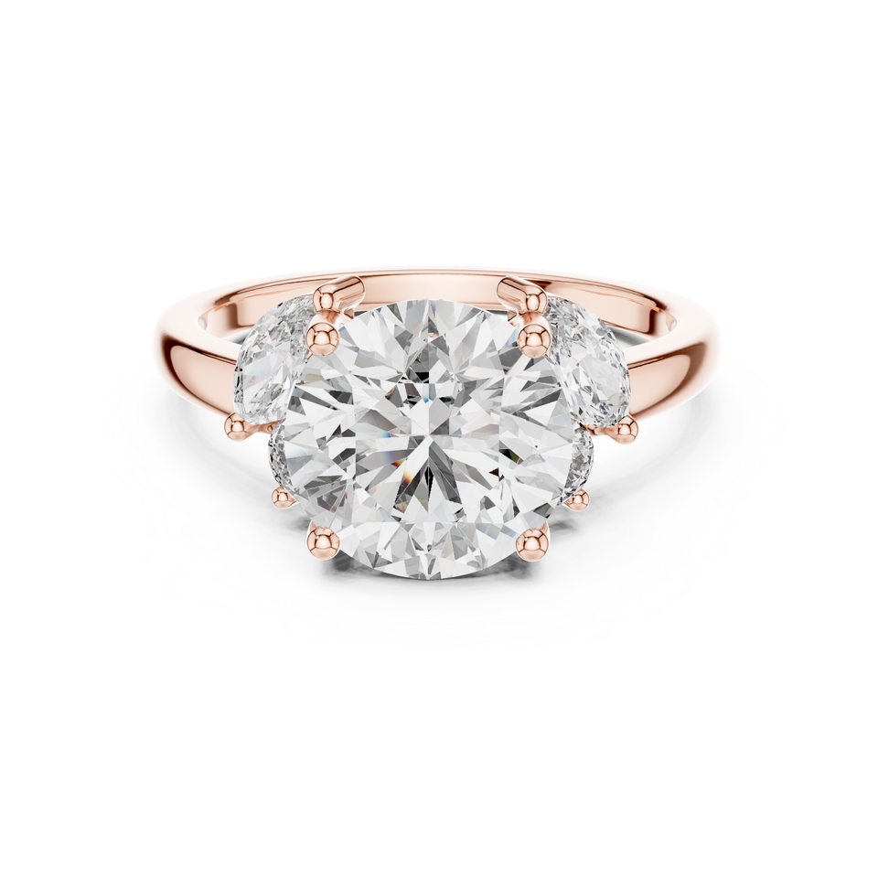 แหวนหมั้นเพชรทรงกลมเพาะเลี้ยงในห้องปฏิบัติการ ประดับเพชรทรงหยดน้ำด้านข้าง ตัวเรือนโรสโกลด์ – แหวนเพชรสามเม็ดสำหรับขอแต่งงานสำหรับผู้หญิง