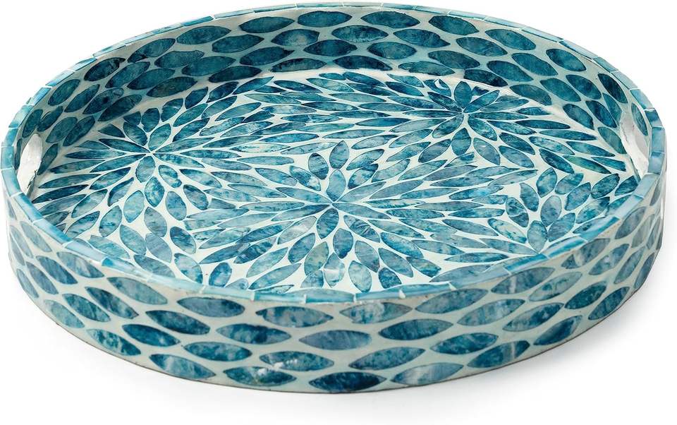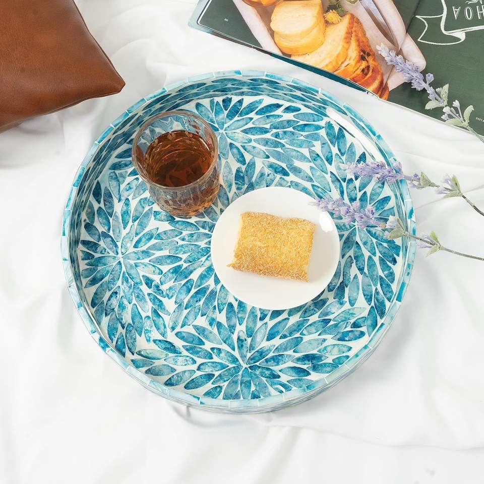 ถาดโมเสกฝังมุกเคลือบแล็กเกอร์ทรงกลมถาดเสิร์ฟไม้หินอ่อนพร้อมที่จับสำหรับชาอาหารเช้าและของตกแต่งบ้าน