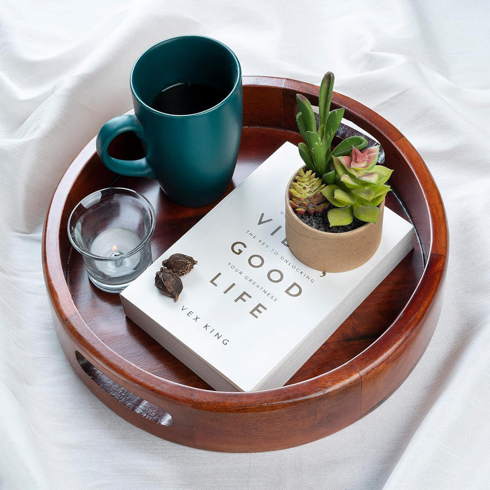 Mango Wood Round Serving Tray with Handles Set of 2