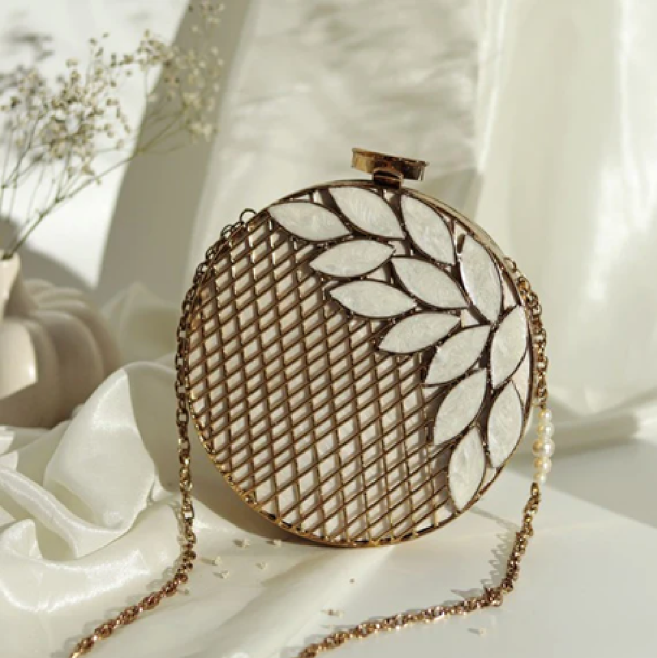 คลัทช์โลหะทรงกลมที่มีแม่ลายใบมุกและลายตารางมีจำหน่ายในราคาขายส่ง
