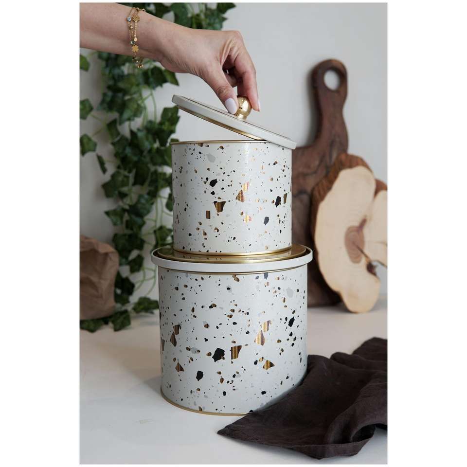 ชุดกล่องดีบุกโลหะทรงกลมขนาดเส้นผ่านศูนย์กลาง175x155-DIA 140x ที่จับ125 (2ชิ้น) ดีไซน์ Terrazo Terrazo