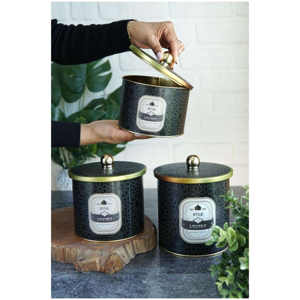 ชุดกระป๋องโลหะทรงกลมขนาดเส้นผ่านศูนย์กลาง140มม. (3ชิ้น) โครงตาข่ายสีดำลายเรขาคณิตสีทอง