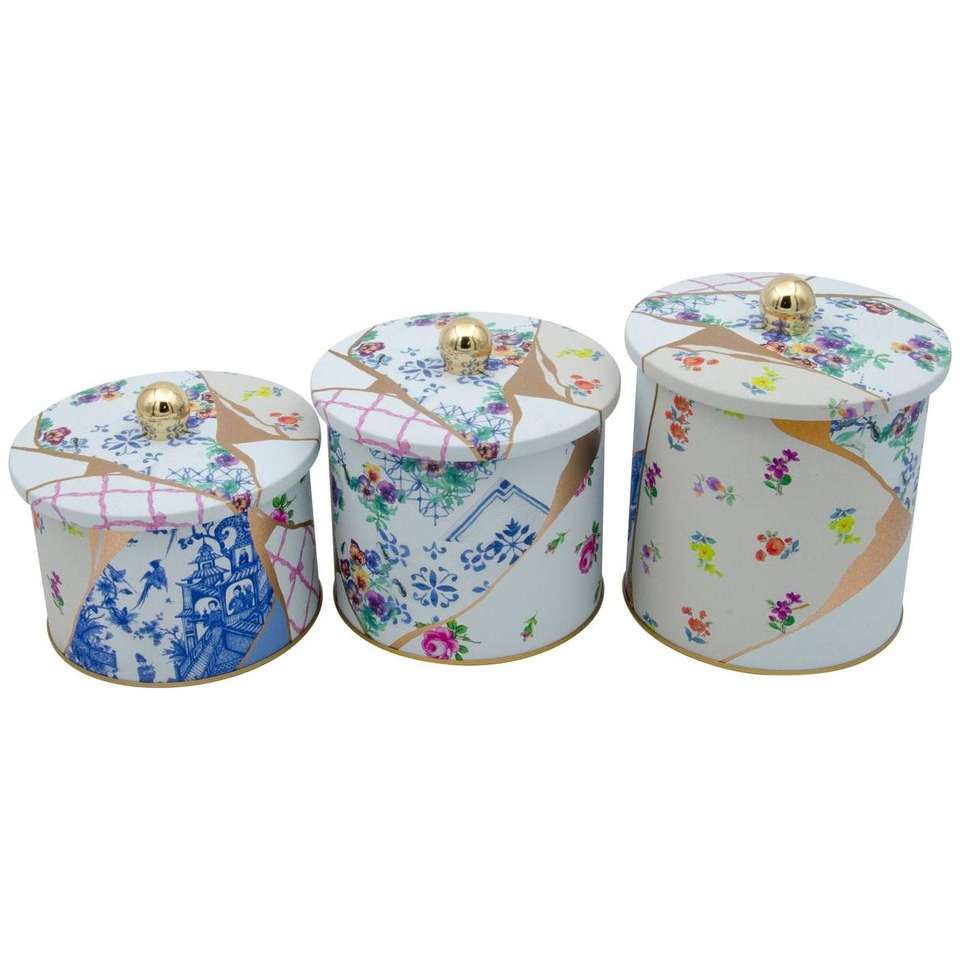 ชุดกระป๋องโลหะทรงกลมขนาดเส้นผ่านศูนย์กลาง140มม. (3ชิ้น) kintsugi ดอกไม้เส้นสีทองดีไซน์แบบ kintsugi