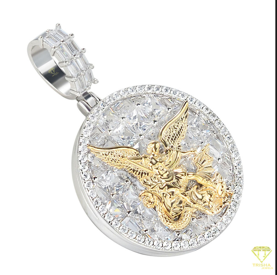 จี้เพชรมอยส์ซอไนต์ทรงกลมพร้อมลายมังกรนางฟ้าเครื่องประดับทางศาสนาสองโทนเครื่องประดับสไตล์ฮิปฮอป